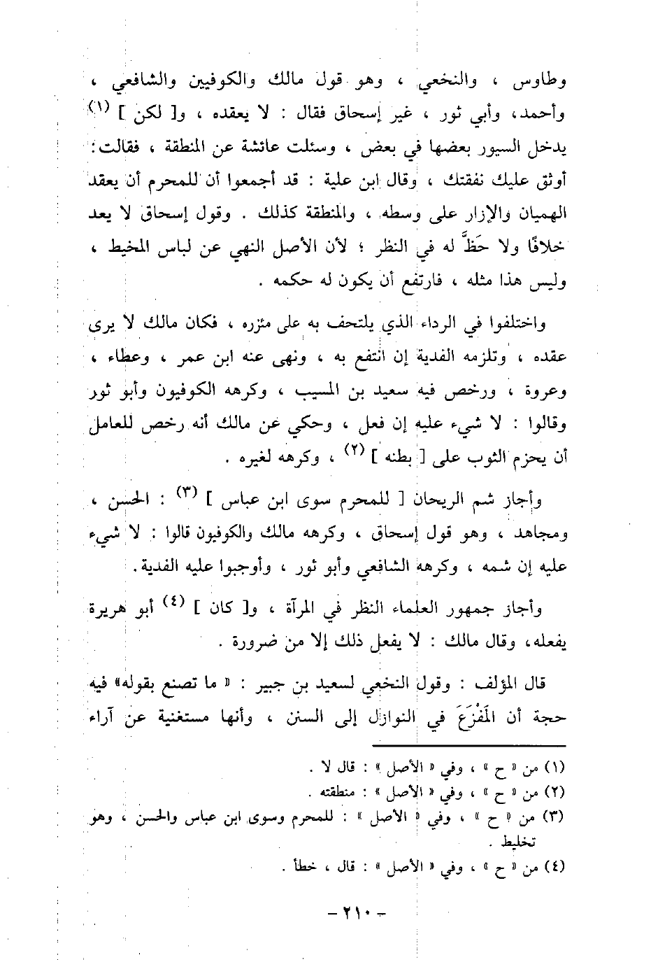 وطاوس، والنخعى، وهو قول مالك والكووفيين والشافعى، وأحمد، وأبى ثور، غير إسحاق فقال: لا يعقده، ولكن يدخل السيور بعضها فى بعض، وسئلت عائشة عن المنطقة، فقالت: أوثق عليك نفقتك، وقال ابن علية: قد أجمعوا أن للمحرم أن يعقد الهيمان والإزار على وسطه، والمنطقة كذلك. وقول إسحاق لا يعد خلافًا ولا حَظَّ له فى النظر؛ لأن الأصل النهى عن لباس المخيط، وليس هذا مثله، فارتفع أن يكون له حكمه. واختلفوا فى الرداء الذى يلتحف به على مئزره، فكان مالك لا يرى عقده، وتلزمه الفدية إن انتفع به، ونهى عنه ابن عمر، وعطاء، وعروة، ورخص فيه سعيد بن المسيب، وكرهه الكوفيون وأبو ثور وقالوا: لا شىء عليه إن فعل، وحكى عن مالك أنه رخص للعامل أن يحزم الثوب على بطنه، وكرهه لغيره. وأجاز شم الريحان للمحرم سوى ابن عباس: الحسن، ومجاهد، وهو قول إسحاق، وكرهه مالك والكوفيون قالوا: لا شىء عليه إن شمه، وكرهه الشافعى وأبو ثور، وأوجبوا عليه الفدية. وأجاز جمهور العلماء النظر فى المرآة، وكان أبو هريرة يفعله، وقال مالك: لا يفعل ذلك إلا من ضرورة. قال المؤلف: وقول النخعى لسعيد بن جبير: (ما تصنع بقوله) فيه حجة أن المَفْزَعَ فى النوازل إلى السنن، وإنها مستغنية عن آراء