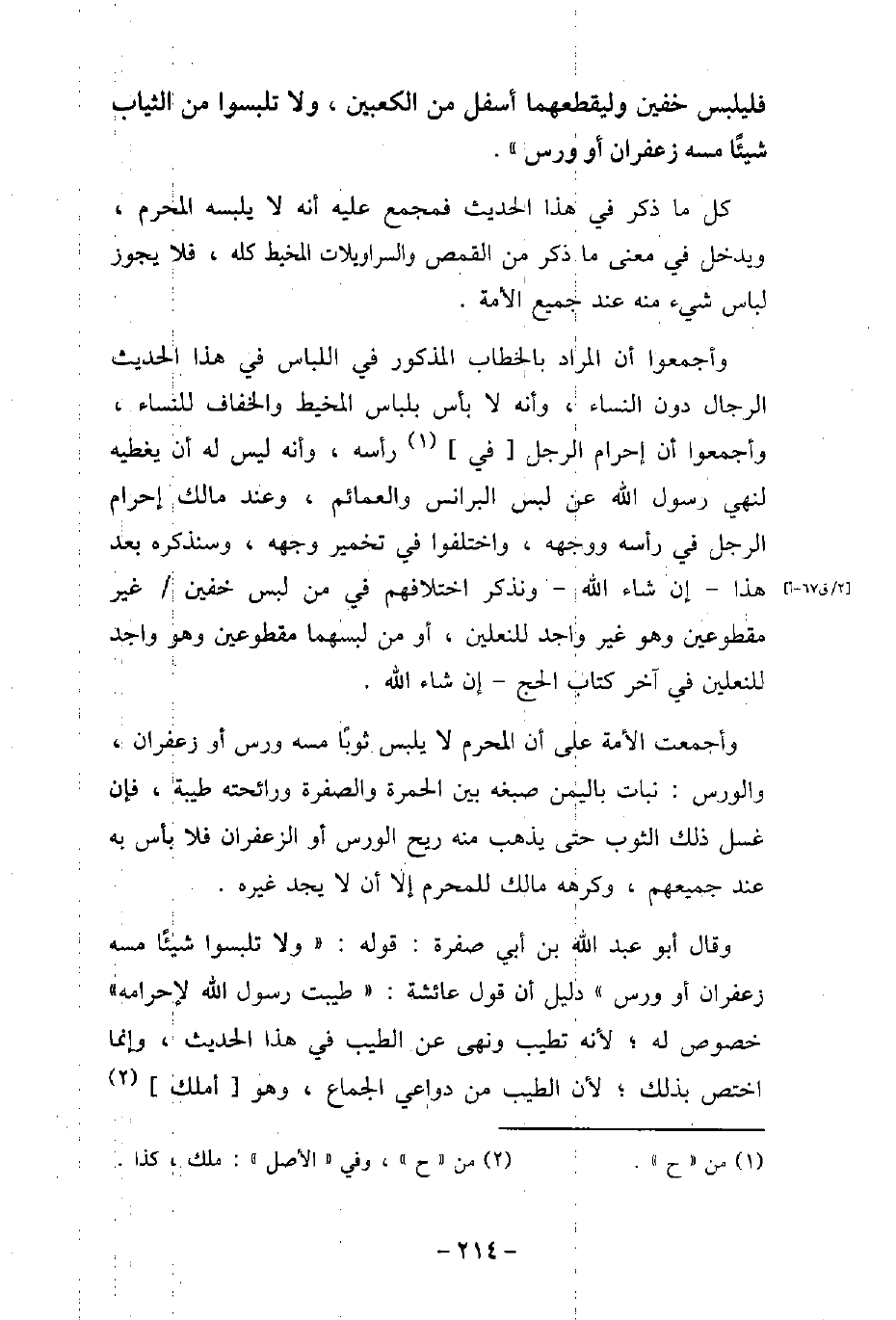فَلْيَلْبَسْ خُفَّيْنِ، وَلْيَقْطَعْهُمَا أَسْفَلَ مِنَ الْكَعْبَيْنِ، وَلا تَلْبَسُوا مِنَ الثِّيَابِ شَيْئًا مَسَّهُ الزَّعْفَرَانُ أَوْ وَرْسٌ) . كل ما ذكر فى هذا الحديث فمجمع عليه أنه لا يلبسه المحرم، ويدخل فى عنى ما ذكر من القمص والسراويلات المخيط كله، فلا يجوز لباس شىء منه عند جميع الأمة. وأجمعوا أن المراد بالخطاب المذكور فى اللباس فى هذا الحديث الرجال دون النساء، أنه لا بأس بلباس المخيط والخفاف للنساء، وأجمعوا أن إحرام الرجل فى رأسه، وأنه ليس له أن يغطيه لنهى رسول الله (صلى الله عليه وسلم) عن لبس البرانس والعمائم، وعند مالك إحرام الرجل فى رأسه ووجهه، واختلفوا فى تخمير وجهه، وسنذكره بعد هذا إن شاء الله، ونذكر اختلافهم فى من لبس خفين غير مقطوعين وهو غير واجد للنعلين، أو من لبسهما مقطوعين وهو واجد للنعلين فى آخر كتاب الحج إن شاء الله. وأجمعت الأمة على أن المحرم لا يلبس ثوبًا مسه ورس أو زعفران، والورس: نبات باليمن صبغه بين الحمرة والصفرة ورائحته طيبة، فإن غسل ذلك الثوب حتى يذهب منه ريح الروس أو الزعفران فلا بأس به عند جميعهم، وكرهه مالك للمحرم إلا أن لا يجد غيره. وقال أبو عبد الله بن أبى صفرة: قوله: (ولا تلبسوا شيئًا مسه زعفران أو روس) دليل أن قول عائشة: (طيبت رسول الله لإحرامه) خصوص له؛ لأنه تطيب ونهى عن الطيب فى هذا الحديث، وإنما اختص بذلك؛ لأن الطيب من دواعى الجماع، وهو أملك