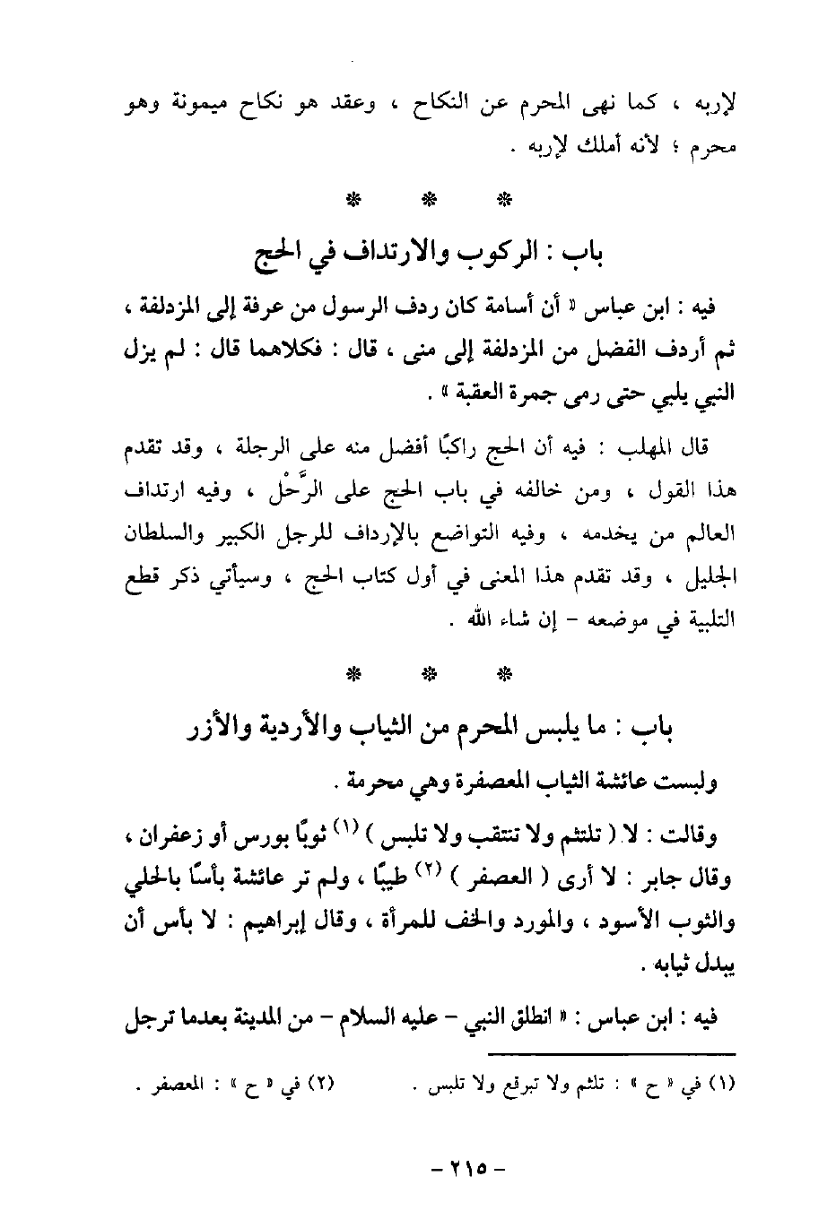 / 24 - فيه: ابْن عَبَّاس، أَنَّ أُسَامَةَ كَانَ رِدْفَ الرسول (صلى الله عليه وسلم) مِنْ عَرَفَةَ إِلَى الْمُزْدَلِفَةِ، ثُمَّ أَرْدَفَ الْفَضْلَ مِنَ الْمزْدَلِفَةِ إِلَى مِنًى، قَالَ: فَكِلاهُمَا، قَالَ: لَمْ يَزَلِ النَّبِىُّ (صلى الله عليه وسلم) يُلَبِّى حَتَّى رَمَى جَمْرَةَ الْعَقَبَةِ. قال المهلب: فيه أن الحج راكبًا أفضل منه على الرجلة، وقد تقدم هذا القول، ومن خالفه فى باب الحج على الرَّحْل، وفيه ارتداف العالم من يخدمه، وفيه التواضع بالإرداف للرجل الكبير والسلطان الجليل، وقد تقدم هذا المعنى فى أول كتاب الحج، وسيأتى ذكر قطع التلبية فى موضعه إن شاء الله.