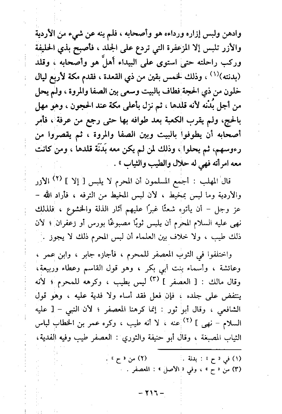 وَادَّهَنَ، وَلَبِسَ إِزَارَهُ وَرِدَاءَهُ هُوَ وَأَصْحَابُهُ، فَلَمْ يَنْهَ عَنْ شَيْءٍ مِنَ الأرْدِيَةِ وَالأزُرِ تُلْبَسُ إِلا الْمُزَعْفَرَةَ الَّتِى تَرْدَعُ عَلَى الْجِلْدِ، فَأَصْبَحَ بِذِى الْحُلَيْفَةِ رَكِبَ رَاحِلَتَهُ حَتَّى اسْتَوَى عَلَى الْبَيْدَاءِ أَهَلَّ هُوَ وَأَصْحَابُهُ، وَقَلَّدَ بَدَنَتَهُ، وَذَلِكَ لِخَمْسٍ بَقِينَ مِنْ ذِى الْقَعْدَةِ فَقَدِمَ مَكَّةَ لأرْبَعِ لَيَالٍ خَلَوْنَ مِنْ ذِى الْحَجَّةِ، فَطَافَ بِالْبَيْتِ، وَسَعَى بَيْنَ الصَّفَا وَالْمَرْوَةِ، وَلَمْ يَحِلَّ مِنْ أَجْلِ بُدْنِهِ؛ لأنَّهُ قَلَّدَهَا، ثُمَّ نَزَلَ بِأَعْلَى مَكَّةَ عِنْدَ الْحَجُونِ، وَهُوَ مُهِلٌّ بِالْحَجِّ، وَلَمْ يَقْرَبِ الْكَعْبَةَ بَعْدَ طَوَافِهِ بِهَا حَتَّى رَجَعَ مِنْ عَرَفَةَ، فَأَمَرَ أَصْحَابَهُ أَنْ يَطَّوَّفُوا بِالْبَيْتِ، وَبَيْنَ الصَّفَا وَالْمَرْوَةِ، ثُمَّ يُقَصِّرُوا مِنْ رُءُوسِهِمْ، ثُمَّ يَحِلُّوا، وَذَلِكَ لِمَنْ لَمْ يَكُنْ مَعَهُ بَدَنَةٌ قَلَّدَهَا، وَمَنْ كَانَتْ مَعَهُ امْرَأَتُهُ فَهِىَ لَهُ حَلالٌ وَالطِّيبُ وَالثِّيَابُ. قال المهلب: أجمع المسلمون أن المحرم لا يلبس إلا الأرز والأردية وما ليس بمخيط، لأن لبس المخيط من الترفه، فأراد الله عز وجل أن يأتوه شعثًا غبرًا آثار الذلة والخشوع، فلذلك نهى عليه السلام المحرم أن يلبس ثوبًا مصبوغًا بورس أو زعفران؛ لأن ذلك طيب، ولا خلاف بين العلماء أن لبس المحرم ذلك لا يجوز. واختلفوا فى الثوب المعصفر للمحرم، فأجازه جابر، وابن عمر، وعائشة، وأسماء بنت أبى بكر، وهو قول القاسم وعطاء وربيعة. وقال مالك: العصفر ليس بطيب، وكرهه للمحرم؛ لأنه ينتفض على جلده، فإن فعل فقد أساء ولا فدية عليه، وهو قول الشافعى، وقال أبو ثور: إنما كرهنا المعصفر؛ لأن النبى عليه السلام نهى عنه، لا أنه طيب، وكره عمر بن الخطاب لباس الثياب المصبغة. وقال أبو حنيفة والثورى: العصفر طيب وفيه الفدية،