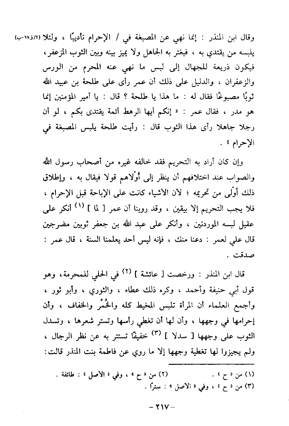 وقال ابن المنذر: إنما نهى عن المصبغة فى الإحرام تأديبًا، ولئلا يلبسه من يقتدى به، فيغتر به الجاهل ولا يميز بينه وبين الثوب المزعفر، فيكون ذريعة للجهال إلى لبس ما نهى عنه المحرم من الورس والزعفران. والدليل على ذلك: أن عمر رأى على طلحة بن عبيد الله ثوبًا مصبوغًا فقال له: ما هذا يا طلحة؟ قال: يا أمير المؤمنين إنما هو مدر، فقال عمر: (إنكم أيها الرهط أئمة يقتدى بكم، لو أن رجلا جاهلا رأى هذا الثوب قال: رأيت طلحة يلبس المصبغة فى الإحرام) . وإن كان أراد به التحريم فقد خالفه غيره من أصحاب رسول الله (صلى الله عليه وسلم) والصواب عند اختلافهم أن ينظر إلى أَوْلاهم قولا فيقال به، وإطلاق ذلك أولى من تحريمه؛ لأن الأشياء كانت على الإباحة قبل الإحرام، فلا يجب التحريم إلا بيقين، وقد روينا أن عمر لما أنكر على عقيل لبسه الموردتين، وأنكر على عبد الله بن جعفر ثوبين مضرجين قال على لعمر: دعنا منك، فإنه ليس أحد يعلمنا السنة، قال عمر: صدقت. قال ابن المنذر: ورخصت عائشة فى الحلى للمحرمة، وهو قول أبى حنيفة وأحمد، وكره ذلك عطاء، والثورى، وأبو ثور، وأجمع العلماء أن المرأة تلبس المخيط كله والخُمُر والخفاف، وأن إحرامها فى وجهها، وأن لها أن تغطى رأسها وتستر شعرها، وتسدل الثوب على وجهها سدلا خفيفًا تستتر به عن نظر الرجال، ولم يجيزوا لها تغطية وجهها إلا ما روى عن فاطمة بنت المنذر. قالت: