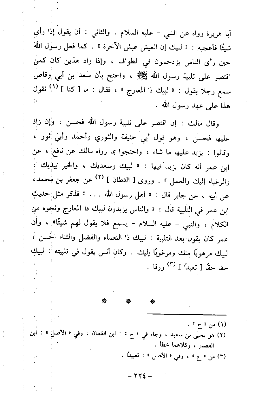 أبا هريرة رواه عن النبى عليه السلام. والثانى: أن يقول إذا رأى شيئًا فأعجبه: (لبيك إن العيش عيش الآخرة) . كما فعل رسول الله (صلى الله عليه وسلم) حين رأى الناس يزدحمون فى الطواف، وإذا زاد هذين كان كمن اقتصر على تلبية رسول الله (صلى الله عليه وسلم) ، واحتج بأن سعد بن أبى وقاص سمع رجلا يقول: (لبيك ذا المعارج) ، فقال: ما كنا نقول هذا على عهد رسول الله (صلى الله عليه وسلم) . وقال مالك: إن اقتصر على تلبية رسول الله (صلى الله عليه وسلم) فحسن، وإن زاد عليها فحسن، وهو قول أبى حنيفة والثورى وأحمد وأبى ثور، وقالوا: يزيد عليها ما شاء، واحتجوا بما رواه مالك عن نافع، عن ابن عمر أنه كان يزيد فيها: (لبيك وسعديك، والخير بيديك، والرغباء إليك والعمل) . وروى القطان عن جعفر بن محمد، عن أبيه، عن جابر قال: (أهل رسول الله (صلى الله عليه وسلم) . .) . فذكر مثل الحديث ابن عمر فى التلبية قال: (والناس يزيدون لبيك ذا المعارج ونحوه من الكلام، والنبى عليه السلام يسمع فلا يقول لهم شيئًا) ، وأن عمر كان يقول بعد التلبية: لبيك ذا النعماء والفضل والثناء الحسن، لبيك مرهوبًا منك ومرغوبًا إليك. وكان أنس يقول فى تلبيته: لبيك حقا حقًا ورقا.