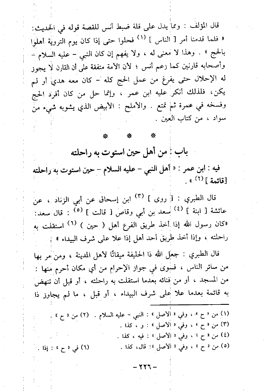 / 30 - فيه: ابْن عُمَرَ، أَهَلَّ النَّبِىُّ، عليه السَّلام، حِينَ اسْتَوَتْ بِهِ رَاحِلَتُهُ قَائِمَةً. قال الطبرى: روى ابن إسحاق عن أبى الزناد، عن عائشة ابنة سعد بن أبى وقاص قالت: قال سعد: (كان رسول الله (صلى الله عليه وسلم) إذا أخذ طريق الفرع أهل حين استقلت به راحلته، وإذا أخذ طريق أحد أهل إذا علا على شرف البيداء) . قال الطبرى: جعل الله ذا الحليفة ميقاتًا لهل المدينة، ومن مر بها من سائر الناس، فسوى فى جواز الإحرام من أى مكان أحرم منها: من المسجد، أو من فنائه بعدما استقلت به راحلته، أو قبل أن تنهض به قائمة بعدما علا على شرف البيداء، أو قبل، ما لم يجاوز ذا