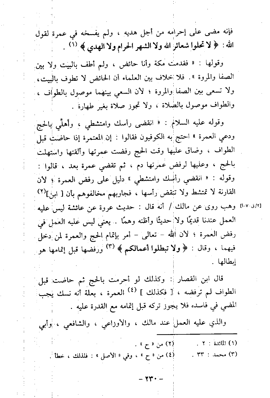 فإنه مضى على إحرامه من أجل هديه، ولم يفسخه فى عمرة لقول الله: (لاَ تُحِلُّوا شَعَآئِرَ اللهِ وَلاَ الشَّهْرَ الْحَرَامَ وَلاَ الْهَدْىَ) [المائدة: 2] . وقولها: (فقدمت مكة وأنا حائض، ولم أطف بالبيت ولا بين الصفا والمروة) . فلا خلاف بين العلماء أن الحائض لا تطوف بالبيت، ولا تسعى بين الصفا والمروة؛ لأن السعى بينهما موصول بالطواف، والطواف موصول بالصلاة، ولا تجوز صلاة بغير طهارة. وقوله عليه السلام: (انقضى رأسك وامتشطى، وأَهلِّى بالحج ودعى العمرة) احتج به الكوفيون فقالوا: إن المعتمرة إذا حاضت قبل الطواف، وضاق عليها وقت الحج رفضت عمرتها وألقتها واستهلت بالحج، وعليها لرفض عمرتها دم، ثم تقضى عمرة بعد، قالوا: وقوله: (انقضى رأسك وامتشطى) دليل على رفض العمرة؛ لأن القارنة لا تمتشط ولا تنفض رأسها، فجاوبهم مخالفوهم بأن ابن وهب روى عن مالك أنه قال: حديث عروة عن عائشة ليس عليه العمل عندنا قديمًا ولا حديثًا وأظنه وهمًا. يعنى ليس عليه العمل فى رفض الدعوة؛ لأن الله تعالى أمر بإتمام الحج والعمرة لمن دخل فيهما، وقال: (وَلاَ تُبْطِلُوا أَعْمَالَكُمْ) [محمد: 33] ورفضها قبل إتمامها هو إبطالها. قال ابن القصار: وكذلك لو احرمت بالحج ثم حاضت قبل الطواف لم ترفضه، فكذلك العمرة، بعلة أنه نسك يجب المضى فى فاسده فلا يجوز تركِه قبل إتمامه مع القدرة عليه. والذى عليه العمل عند مالك، والأوزاعى، والشافعى، وأبى