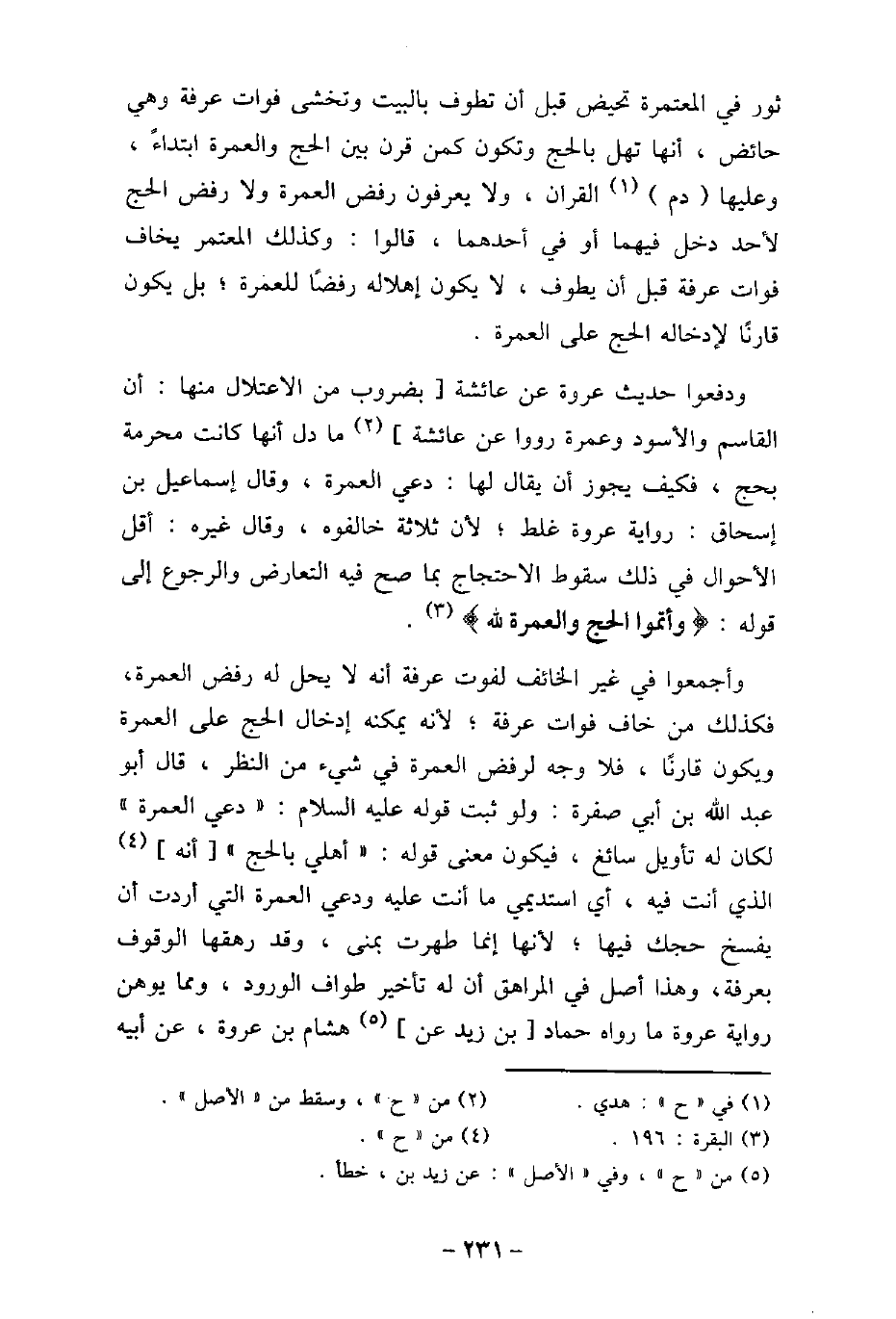 ثور فى المعتمرة تحيض قبل أن تطوف بالبيت وتخشى فوات عرفة وهى حائض، أنها تهل بالحج وتكون كمن قرن بين الحج والعمرة ابتداءَ، وعليها دم القران، ولا يعرفون رفض العمرة ولا رفض الحج لأحد دخل فيهما أو فى أحدهما، قالوا: وكذلك المعتمر يخاف فوات عرفة قبل أن يطوف، لا يكون إهلاله رفضًا للعمرة؛ بل يكون قارنًا لإدخاله الحج على العمرة. ودفعوا حديث عروة عن عائشة بضروب من الاعتلال منها: أن القاسم والأسود وعمرة رووا عن عائشة ما دل أنها كانت محرمة بحج، فكيف يجوز أن يقال لها: دعى العمرة، وقال إسماعيل بن إسحاق: رواية عروة غلط؛ لأن الثلاثة خالفوه، وقال غيره: أقل الأحوال فى ذلك سقوط الاحتجاج بما صح فيه التعارض والرجوع إلى قوله: (وَأَتِمُّوا الْحَجَّ وَالْعُمْرَةَ لِلّهِ) [البقرة: 196] . وأجمعوا فى غير الخائف لفوت عرفة أنه لا يحل له رفض العمرة، فكذلك من خاف فوات عرفة؛ لأنه يمكنه إدخال الحج على العمرة ويكون قارنًا، فلا وجه لرفض العمرة فى شىء من النظر. قال أبو عبد الله بن أبى صفرة: ولو ثبت قوله عليه السلام: (دعى العمرة) لكان له تأويل سائغ، فيكون معنى قوله: (أهلى بالحج) أنه الذى أنت فيه، أى استديمى ما أنت عليه ودعى العمرة التى أردت أن يفسخ حجك فيها؛ لأنها إنما طهرت بمنى، وقد رهقها الوقوف بعرفة، وهذا أصل فى المراهق أن له تأخير طواف الورود، ومما يوهن رواية عروة ما رواه حماد بن زيد عن هشام بن عروة، عن أبيه