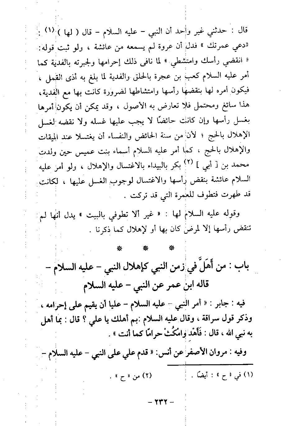 . / 34 - فيه: جَابِر، أَمَرَ النَّبِىُّ، عليه السَّلام، عَلِيًّا أَنْ يُقِيمَ عَلَى إِحْرَامِهِ، وَذَكَرَ قَوْلَ سُرَاقَةَ. وَقَالَ، عليه السَّلام: (بِمَا أَهْلَلْتَ يَا عَلِىُّ؟) قَالَ: بِمَا أَهَلَّ بِهِ نبِى اللَّه، قَالَ: (فَأَهْدِ، وَامْكُثْ حَرَامًا كَمَا أَنْتَ) . / 35 - وفيه: مَرْوَانَ الأصْفَرَ، عَنْ أَنَس، قَدِمَ عَلِىٌّ عَلَى النَّبِىِّ، عليه السَّلام،