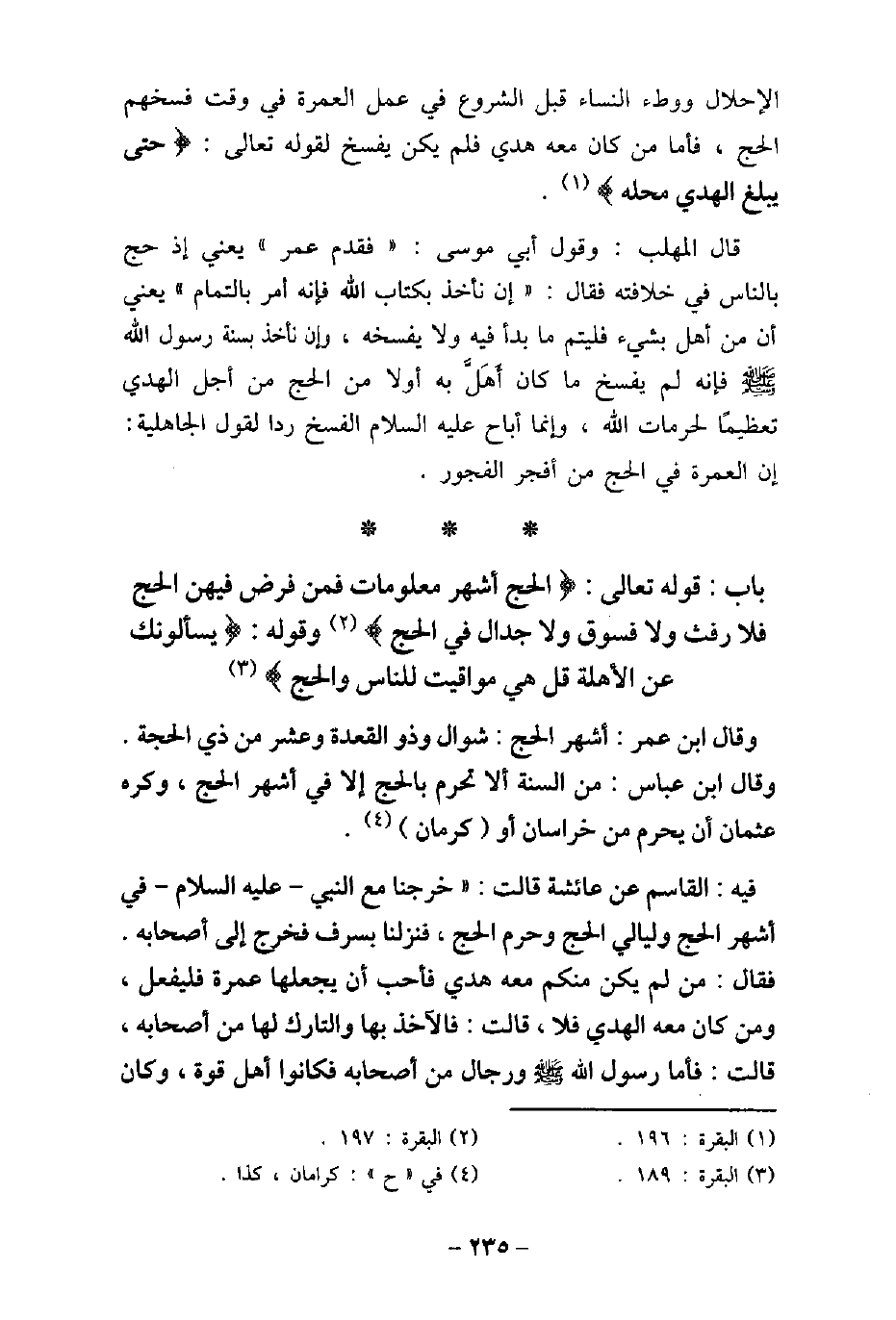 الإحلال ووطء النساء قبل الشروع فى عمل العمرة فى وقت فسخهم الحج، فأما من كان معه هدى فلم يكن يفسخ لقوله تعالى: (حَتَّى يَبْلُغَ الْهَدْىُ مَحِلَّهُ) [البقرة: 196] . قال المهلب: وقول أبى موسى: (فقدم عمر) يعنى إذ حج بالناس فى خلافته فقال: (إن نأخذ بكتاب الله فإنه أمر بالتمام) يعنى أن من أهل بشىء فليتم ما بدأ فيه ولا يفسخه، وإن نأخذ بسنة رسول الله (صلى الله عليه وسلم) فإنه لم يفسخ ما كان أَهَلَّ به أولا من الحج من أجل الهدى تعظيمًا لحرمات الله، وإنما أباح عليه السلام الفسخ ردا لقول الجاهلية: إن العمرة فى الحج من أفجر الفجور.