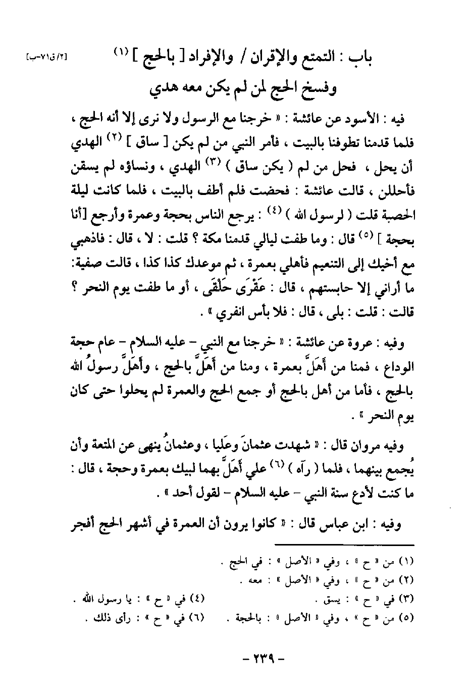 / 38 - فيه: الأسْوَدِ، عَنْ عَائِشَةَ، خَرَجْنَا مَعَ الرسول (صلى الله عليه وسلم) وَلا نُرَى إِلا أَنَّهُ الْحَجُّ، فَلَمَّا قَدِمْنَا تَطَوَّفْنَا بِالْبَيْتِ، فَأَمَرَ النَّبِىُّ (صلى الله عليه وسلم) مَنْ لَمْ يَكُنْ سَاقَ الْهَدْىَ أَنْ يَحِلَّ، فَحَلَّ مَنْ لَمْ يَكُنْ سَاقَ الْهَدْيَ، وَنِسَاؤُهُ لَمْ يَسُقْنَ فَأَحْلَلْنَ، قَالَتْ عَائِشَةُ: فَحِضْتُ، فَلَمْ أَطُفْ بِالْبَيْتِ، فَلَمَّا كَانَتْ لَيْلَةُ الْحَصْبَةِ، قلت: يَا رَسُولَ اللَّهِ، يَرْجِعُ النَّاسُ بِعُمْرَةٍ وَحَجَّةٍ، وَأَرْجِعُ أَنَا بِحَجَّةٍ، قَالَ: (وَمَا طُفْتِ لَيَالِىَ قَدِمْنَا مَكَّةَ) ؟ قُلْتُ: لا، قَالَ: (فَاذْهَبِى مَعَ أَخِيكِ إِلَى التَّنْعِيمِ، فَأَهِلِّى بِعُمْرَةٍ، ثُمَّ مَوْعِدُكِ كَذَا وَكَذَا) ، قَالَتْ صَفِيَّةُ: مَا أُرَانِى إِلا حَابِسَتَهُمْ، قَالَ: (عَقْرَى حَلْقَى أَوَ مَا طُفْتِ يَوْمَ النَّحْرِ) ؟ قَالَتْ: قُلْتُ: بَلَى، قَالَ: (لا بَأْسَ، انْفِرِى) . / 39 - وفيه: عُرْوَةَ، عَنْ عَائِشَةَ، خَرَجْنَا مَعَ النَّبِىّ، عليه السَّلام، عَامَ حَجَّةِ الْوَدَاعِ، فَمِنَّا مَنْ أَهَلَّ بِعُمْرَةٍ، [وَمِنَّا مَنْ أَهَلَّ بِحَجَّةٍ وَعُمْرَةٍ] ، وَمِنَّا مَنْ أَهَلَّ بِالْحَجِّ، وَأَهَلَّ رَسُولُ اللَّهِ (صلى الله عليه وسلم) بِالْحَجِّ، فَأَمَّا مَنْ أَهَلَّ بِالْحَجِّ، أَوْ جَمَعَ الْحَجَّ وَالْعُمْرَةَ، لَمْ يَحِلُّوا حَتَّى كَانَ يَوْمُ النَّحْرِ. / 40 - وفيه: مَرْوَانَ، قَالَ: شَهِدْتُ عُثْمَانَ وَعَلِيًّا، وَعُثْمَانُ يَنْهَى عَنِ الْمُتْعَةِ، وَأَنْ يُجْمَعَ بَيْنَهُمَا، فَلَمَّا رَأَى عَلِىٌّ أَهَلَّ بِهِمَا، لَبَّيْكَ بِعُمْرَةٍ وَحَجَّةٍ، قَالَ: مَا كُنْتُ لأدَعَ سُنَّةَ النَّبِىِّ، عليه السَّلام، لِقَوْلِ أَحَدٍ. / 41 - وفيه: ابْن عَبَّاس، قَالَ: كَانُوا يَرَوْنَ أَنَّ الْعُمْرَةَ فِى أَشْهُرِ الْحَجِّ أَفْجَرِ