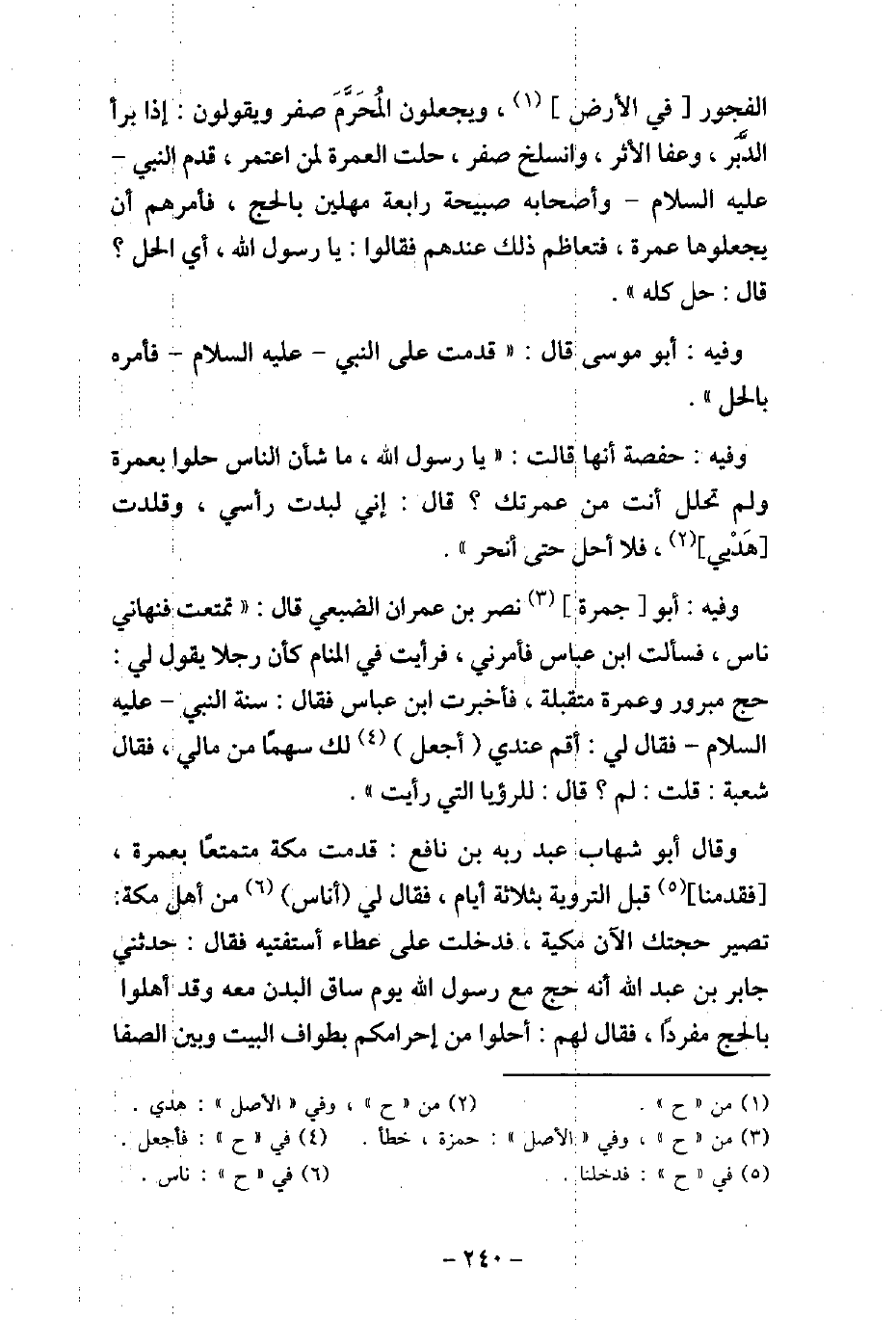 الْفُجُورِ فِى الأرْضِ، وَيَجْعَلُونَ الْمُحَرَّمَ صَفَرًا، وَيَقُولُونَ: إِذَا بَرَا الدَّبَرْ، وَعَفَا الأثَرْ، وَانْسَلَخَ صَفَرْ، حَلَّتِ الْعُمْرَةُ لِمَنِ اعْتَمَرْ، قَدِمَ النَّبِىُّ، عليه السَّلام، وَأَصْحَابُهُ صَبِيحَةَ رَابِعَةٍ مُهِلِّينَ بِالْحَجِّ، فَأَمَرَهُمْ أَنْ يَجْعَلُوهَا عُمْرَةً، فَتَعَاظَمَ ذَلِكَ عِنْدَهُمْ، فَقَالُوا: يَا رَسُولَ اللَّهِ، أَىُّ الْحِلِّ؟ قَالَ: (حِلٌّ كُلُّهُ) . / 42 - وفيه: أَبُو مُوسَى، قَالَ: قَدِمْتُ عَلَى النَّبِىِّ، عليه السَّلام، فَأَمَرَهُ بِالْحِلِّ. / 43 - وفيه: حَفْصَةَ، أَنَّهَا قَالَتْ: يَا رَسُولَ اللَّهِ، مَا شَأْنُ النَّاسِ حَلُّوا بِعُمْرَةٍ وَلَمْ تَحْلِلْ أَنْتَ مِنْ عُمْرَتِكَ؟ قَالَ: (إِنِّى لَبَّدْتُ رَأْسِى، وَقَلَّدْتُ هَدْيِى، فَلا أَحِلُّ حَتَّى أَنْحَرَ) . / 44 - وفيه: أَبُو جَمْرَةَ نَصْرُ بْنُ عِمْرَانَ الضُّبَعِىُّ، قَالَ: تَمَتَّعْتُ، فَنَهَانِى نَاسٌ، فَسَأَلْتُ ابْنَ عَبَّاسٍ فَأَمَرَنِى، فَرَأَيْتُ فِى الْمَنَامِ، كَأَنَّ رَجُلا يَقُولُ لِى: حَجٌّ مَبْرُورٌ وَعُمْرَةٌ مُتَقَبَّلَةٌ، فَأَخْبَرْتُ ابْنَ عَبَّاسٍ، فَقَالَ: سُنَّةَ النَّبِىِّ، عليه السَّلام، فَقَالَ: لِى أَقِمْ عِنْدِى، فَأَجْعَلَ لَكَ سَهْمًا مِنْ مَالِى، قَالَ شُعْبَةُ: فَقُلْتُ: لِمَ؟ فَقَالَ: لِلرُّؤْيَا الَّتِى رَأَيْتُ. / 45 - وفيه: أَبُو شِهَابٍ عبد ربه بْن نافع، قَدِمْتُ مُتَمَتِّعًا مَكَّةَ بِعُمْرَةٍ، فَدَخَلْنَا قَبْلَ التَّرْوِيَةِ بِثَلاثَةِ أَيَّامٍ، فَقَالَ لِى أُنَاسٌ مِنْ أَهْلِ مَكَّةَ: تَصِيرُ حَجَّتُكَ الآنَ مَكِّيَّةً، فَدَخَلْتُ عَلَى عَطَاءٍ أَسْتَفْتِيهِ، فَقَالَ: حَدَّثَنِى جَابِرُ بْنُ عَبْدِاللَّهِ، أَنَّهُ حَجَّ مَعَ رسُول اللَّه (صلى الله عليه وسلم) يَوْمَ سَاقَ الْبُدْنَ مَعَهُ، وَقَدْ أَهَلُّوا بِالْحَجِّ مُفْرَدًا، فَقَالَ لَهُمْ: (أَحِلُّوا مِنْ إِحْرَامِكُمْ بِطَوَافِ الْبَيْتِ وَبَيْنَ الصَّفَا