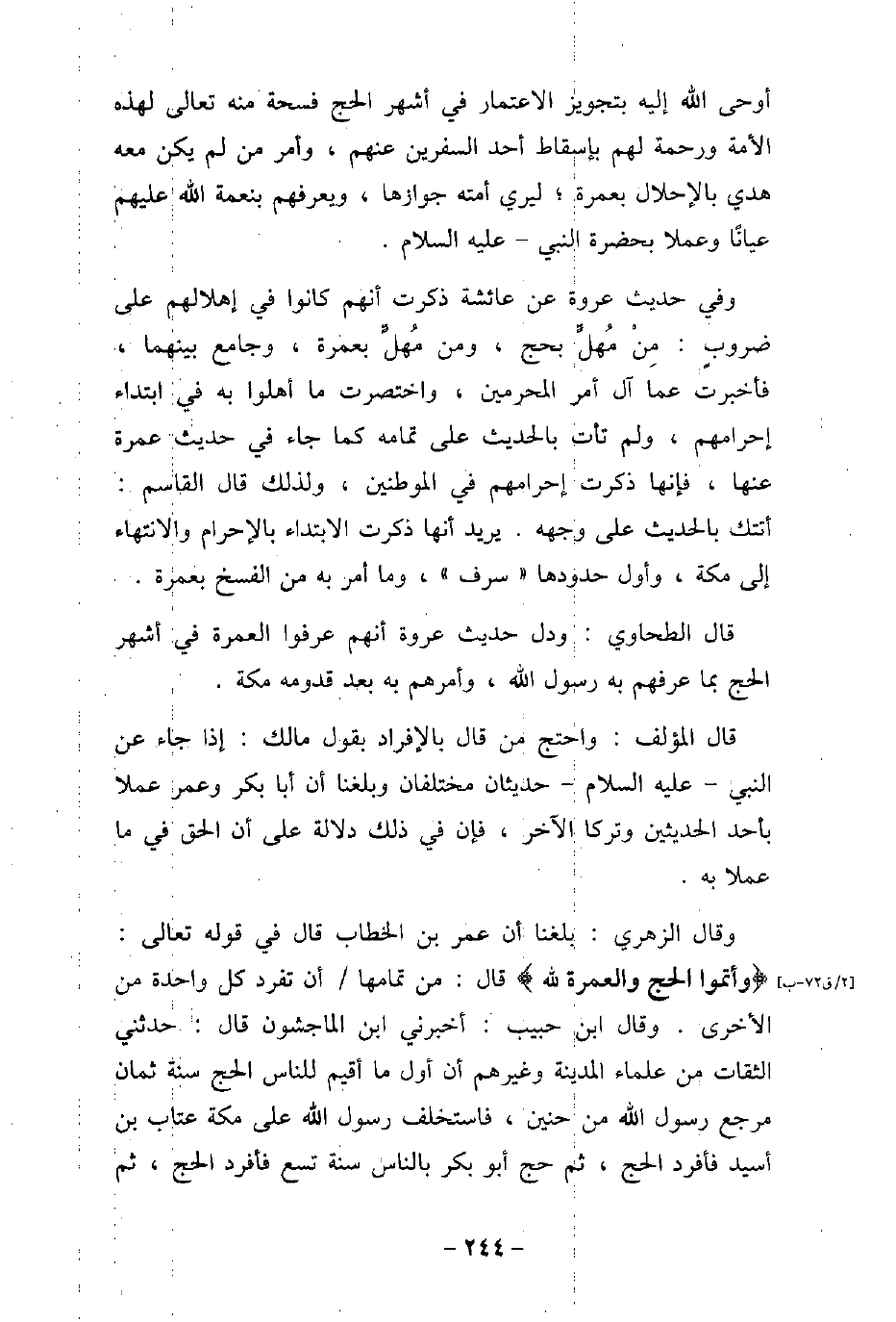 أوحى الله إليه بتجويز الاعتمار فى أشهر الحج فسخة منه تعالى لهذه الأمة ورحمة لهم بإسقاط أحد السفرين عنهم، وأمر من لم يكن معه هدى بالإحلال بعمرة؛ ليرى أمته جوازها، ويعرفهم بنعمة الله عليهم عيانًا وعملا بحضرة النبى عليه السلام. وفى حديث عروة عن عائشة ذكرت أنهم كانوا فى إهلالهم على ضروبٍ: مِنْ مُهلٍّ بحج، ومن مُهلٍّ بعمرة، وجامع بينهما، فأخبرت عمال آل أمر المحرمين، واختصرت ما أهلوا به فى ابتداء إحرامهم، ولم تأت بالحديث على تمامه كما جاء فى حديث عمرة عنها، فإنها ذكرت إحرامهم فى الموطنين، ولذلك قال القاسم: أتتك بالحديث على وجهه. يريد أنها ذكرت الابتداء بالإحرام والانتهاء إلى مكة، وأول حدودها (سرف) ، وما أمر به من الفسخ بعمرة. قال الطحاوى: ودل حديث عروة أنهم عرفوا العمرة فى أشهر الحج بما عرفهم به رسول الله (صلى الله عليه وسلم) ، وأمرهم به بعد قدومه مكة. قال المؤلف: واحتج من قال بالإفراد بقول مالك: إذا جاء عن النبى عليه السلام حديثان مختلفان وبلغنا أن أبا بكر وعمر عملا بأحد الحديثين وتركا الآخر، فإن فى ذلك دلالة على أن الحق فى ما عملا به. وقال الزهرى: بلغنا أن عمر بن الخطاب قال فى قوله تعالى: (وَأَتِمُّوا الْحَجَّ وَالْعُمْرَةَ لِلّهِ) [البقرة: 196] ، قال: من تمامها أن تفرد كل واحدة من الأخرى. وقال ابن حبيب: أخبرنى ابن الماجشون قال: حدثنى الثقات من علماء المدينة وغيرهم أن أول ما أقيم للناس الحج سنة ثمان مرجع رسول الله (صلى الله عليه وسلم) من حنين، فاستخلف رسول الله (صلى الله عليه وسلم) على مكة عتاب بن أسيد فأفرد الحج، ثم حج أبو بكر بالناس سنة تسع فأفرد الحج،