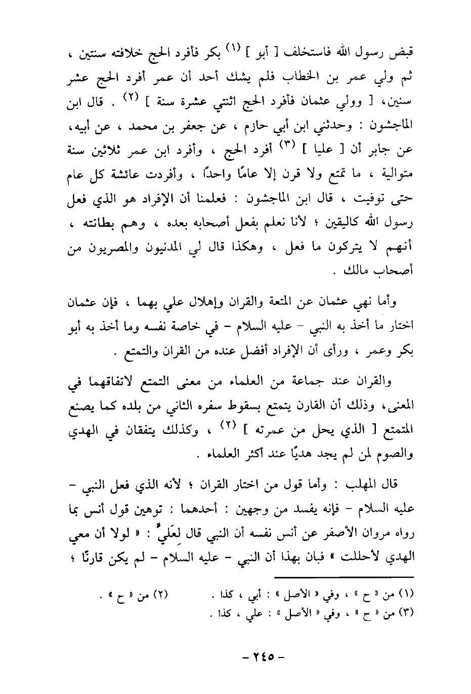 ثم قبض رسول الله (صلى الله عليه وسلم) فاستخلف أبو بكر فأفرد الحج خلافته سنتين، ثم ولى عمر بن الخطاب فلم يشك أحد أن عمر أفرد الحج عشر سنين، وولى عثمان فأفرد الحج اثنتى عشرة سنة. قال ابن الماجشون: وحدثنى ابن أبى حازم، عن جعفر بن محمد، عن أبيه، عن جابر أن عليا أفرد الحج، وأفرد ابن عمر ثلاثين سنة متوالية، ما تمتع ولا قرن إلا عامًا واحدًا، وأفردت عائشة كل عام حتى توفيت، قال ابن الماجشون: فعلمنا أن الإفراد هو الذى فعل رسول الله (صلى الله عليه وسلم) كاليقين؛ لأنا نعلم بفعل أصحابه بعده، وهم بطانته، أنهم لا يتركون ما فعل، وهكذا قال لى المدنيون والمصريون من أصحاب مالك. وأما نهى عثمان عن المتعة والقران وإهلال على بهما، فإن عثمان اختار ما أخذ به النبى عليه السلام فى خاصة نفسه وما أخذ به أبو بكر وعمر، ورأى أن الإفراد أفضل عنده من القران والتمتع. والقران عند جماعة من العلماء من معنى التمتع لاتفاقهما فى المعنى، وذلك أن القارن يتمتع بسقوط سفره الثانى من بلده كما يصنع المتمتع الذى يحل من عمرته، وكذلك يتفقان فى الهدى والصوم لمن لم يجد هديًا عند أكثر العلماء. قال المهلب: وأما قول من اختار القران؛ لأنه الذى فعل النبى عليه السلام فإنه يفسد من وجهين: أحدهما: توهين قول أنس بما رواه مروان الأصفر عن أنس نفسه أن النبى (صلى الله عليه وسلم) قال لِعَلىٍّ: (لولا أن معى الهدى لأحللت) فبان بهذا أن النبى عليه السلام لم يكن قارنًا؛