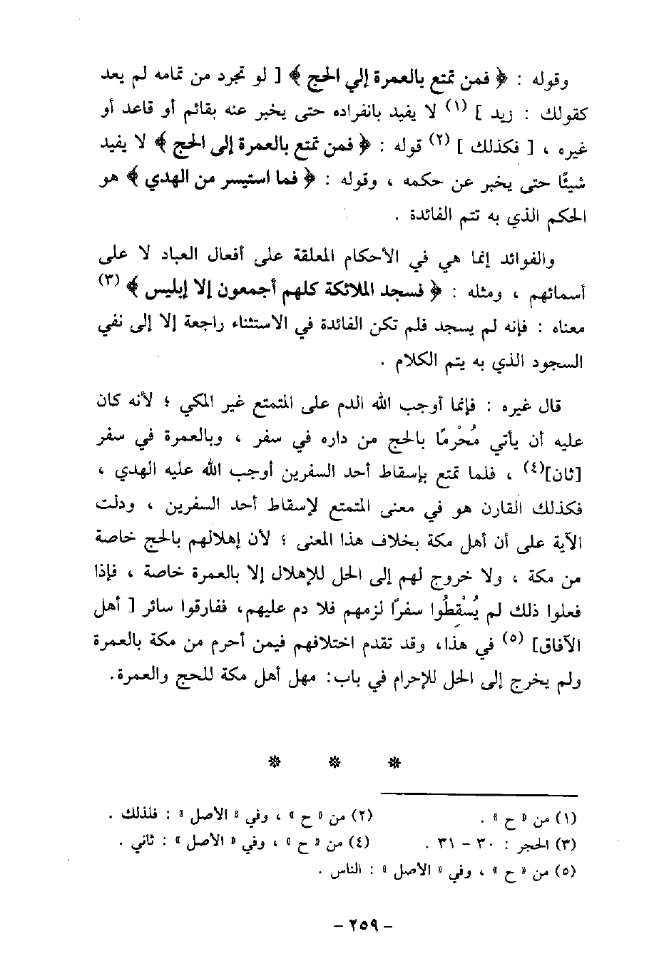 وقوله: (فَمَن تَمَتَّعَ بِالْعُمْرَةِ إِلَى الْحَجِّ (لو تجرد من تمامه لم يعد كقوله: زيد لا يفيد بانفراده حتى يخبر عنه بقائم أو قاعد أو غيره، فكذلك قوله: (فَمَن تَمَتَّعَ بِالْعُمْرَةِ إِلَى الْحَجِّ (لا يفيد شيئًا حتى يخبر عن حكمه، قوله: (فَمَا اسْتَيْسَرَ مِنَ الْهَدْىِ (هو الحكم الذى به تتم الفائدة. والفوائد إنما هى فى الأحكام المعلقة على أفعال العباد لا على أسمائهم، ومثله: (فَسَجَدَ الْمَلآئِكَةُ كُلُّهُمْ أَجْمَعُونَ إِلاَّ إِبْلِيسَ) [الحجر: 30، 31] معناه: فإنه لم يسجد فلم تكن الفائدة فى الاستثناء راجعة إلا إلى نفى السجود الذى به يتم الكلام. قال غيره: فإنما أوجب الله الدم على المتمتع غير المكى؛ لأنه كان عليه أن يأتى مُحْرمًا بالحج من داره فى سفر، وبالعمرة فى سفر ثان، فلما تمتع بإسقاط أحد السفرين أوجب الله عليه الهدى، فكذلك القارن هو فى معنى المتمتع لإسقاط أحد السفرين، ودلت الآية على أن أهل مكة بخلاف هذا المعنى؛ لأن إهلالهم بالحج خاصة من مكة، ولا خروج لهم إلى الحل للإهلال إلا بالعمرة خاصة، فإذا فعلوا ذلك لم يُسْقِطُوا سفرًا لزمهم فلا دم عليهم، ففارقوا سائر أهل الآفاق فى هذا، وقد تقدم اختلافهم فيمن أحرم من مكة بالعمرة ولم يخرج إلى الحل للإحرام فى باب: مهل أهل مكة للحج والعمرة.