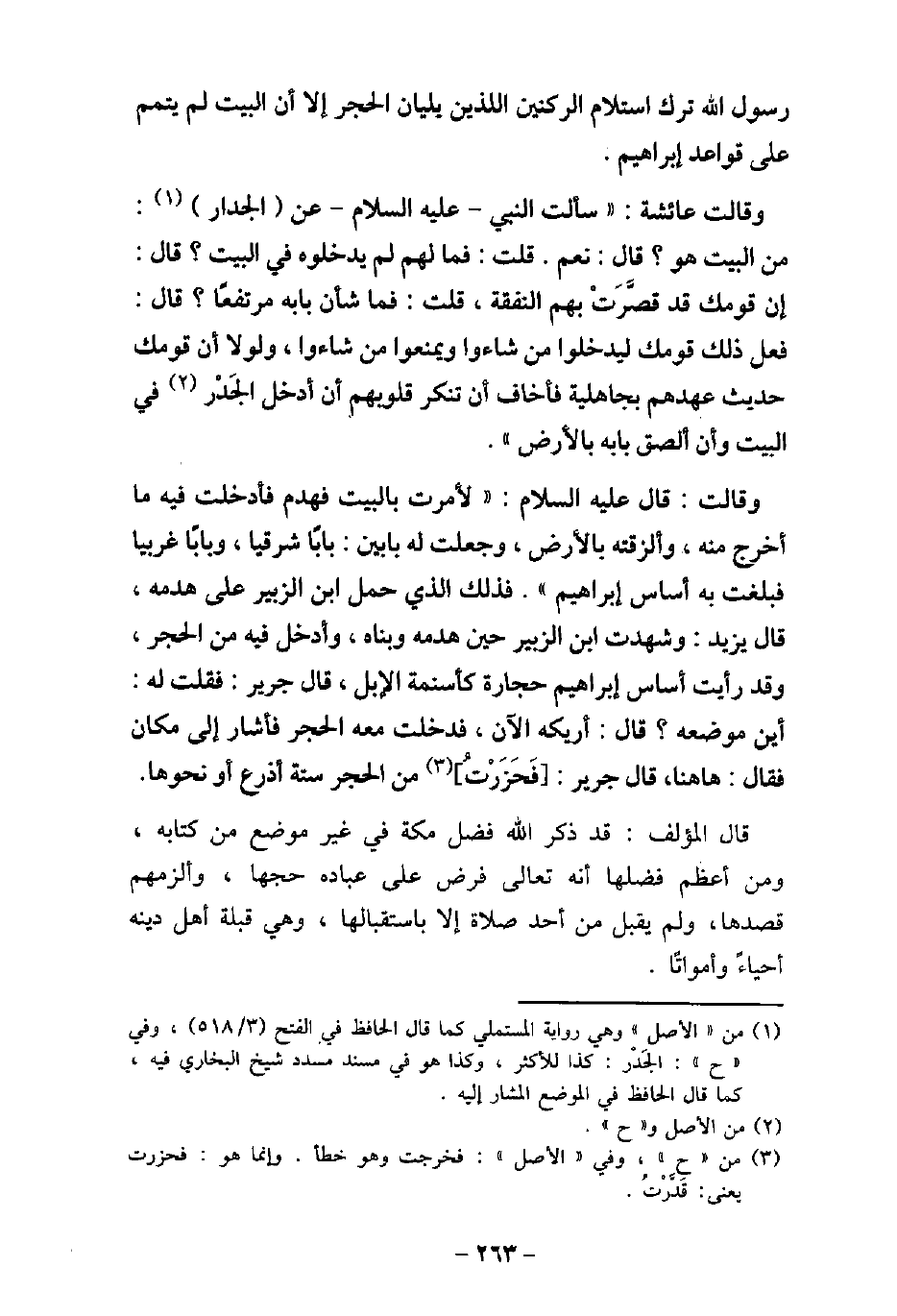 رَسُولَ اللَّهِ (صلى الله عليه وسلم) تَرَكَ اسْتِلامَ الرُّكْنَيْنِ اللَّذَيْنِ يَلِيَانِ الْحِجْرَ إِلا أَنَّ الْبَيْتَ لَمْ يُتَمَّمْ عَلَى قَوَاعِدِ إِبْرَاهِيمَ. / 56 - وفيه: عَائِشَةَ، سَأَلْتُ النَّبِىَّ، عليه السَّلام، عَنِ الْجَدْرِ أَمِنَ الْبَيْتِ هُوَ؟ قَالَ: (نَعَمْ) ، قُلْتُ: فَمَا لَهُمْ لَمْ يُدْخِلُوهُ فِى الْبَيْتِ؟ قَالَ: (إِنَّ قَوْمَكِ قَصَّرَتْ بِهِمُ النَّفَقَةُ) ، قُلْتُ: فَمَا شَأْنُ بَابِهِ مُرْتَفِعًا؟ قَالَ: (فَعَلَ ذَلِكَ قَوْمُكِ لِيُدْخِلُوا مَنْ شَاءُوا، وَيَمْنَعُوا مَنْ شَاءُوا، وَلَوْلا أَنَّ قَوْمَكِ حَدِيثٌ عَهْدُهُمْ بِالْجَاهِلِيَّةِ، فَأَخَافُ أَنْ تُنْكِرَ قُلُوبُهُمْ أَنْ أُدْخِلَ الْجَدْرَ فِى الْبَيْتِ وَأَنْ أُلْصِقَ بَابَهُ بِالأرْضِ) . / 57 - وقالت: قال عليه السَّلام: (لأمَرْتُ بِالْبَيْتِ فَهُدِمَ، فَأَدْخَلْتُ فِيهِ مَا أُخْرِجَ مِنْهُ، وَأَلْزَقْتُهُ بِالأرْضِ، وَجَعَلْتُ لَهُ بَابَيْنِ بَابًا شَرْقِيًّا، وَبَابًا غَرْبِيًّا، فَبَلَغْتُ بِهِ أَسَاسَ إِبْرَاهِيمَ) . فَذَلِكَ الَّذِى حَمَلَ ابْنَ الزُّبَيْرِ عَلَى هَدْمِهِ. قَالَ يَزِيدُ: وَشَهِدْتُ ابْنَ الزُّبَيْرِ حِينَ هَدَمَهُ وَبَنَاهُ وَأَدْخَلَ فِيهِ مِنَ الْحِجْرِ، وَقَدْ رَأَيْتُ أَسَاسَ إِبْرَاهِيمَ حِجَارَةً كَأَسْنِمَةِ الإبِلِ. قَالَ جَرِيرٌ: فَقُلْتُ لَهُ: أَيْنَ مَوْضِعُهُ؟ قَالَ: أُرِيكَهُ الآنَ، فَدَخَلْتُ مَعَهُ الْحِجْرَ، فَأَشَارَ إِلَى مَكَانٍ، فَقَالَ: هَاهُنَا، قَالَ جَرِيرٌ: فَحَزَرْتُ مِنَ الْحِجْرِ سِتَّةَ أَذْرُعٍ أَوْ نَحْوَهَا. قال المؤلف: قد ذكر الله فضل مكة فى غير موضع من كتابه، ومن أعظم فضلها أنه تعالى فرض على عباده حجها، وألزمهم قصدها، ولم يقبل من أحد إلا باستقبالها، وهى قبلة أهل دينه أحياءً وأمواتًا.