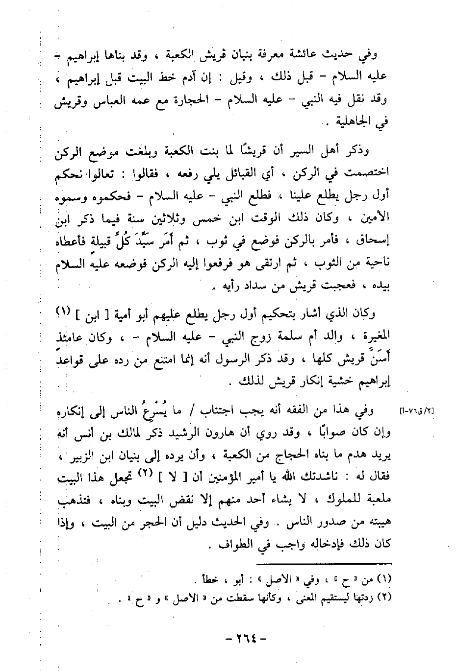وفى حديث عائشة معرفة بنيان قريش الكعبة، وقد بناها إبراهيم عليه السلام قبل ذلك، وقيل: إن آدم خط البيت قبل إبراهيم، وقد نقل فيه النبى عليه السلام الحجارة مع عمه العباس وقريش فى الجاهلية. وذكر أهل السير أن قريشًا لما بنت الكعبة وبلغت موضع الركن اختصمت فى الركن، أى القبائل يلى رفعه، فقالوا: تعالوا نحكم أول رجل يطلع علينا، فطلع النبى عليه السلام فحكموه وسموه الأمين، وكان ذلك الوقت ابن خمس وثلاثين سنة فيما ذكر ابن إسحاق، فأمر بالركن فوضع فى ثوب، ثم أَمَر سَيِّدَ كُلِّ قبيلةٍ فأعطاه ناحية من الثوب، ثم ارتقى هو فرفعوا إليه الركن فوضعه عليه السلام بيده، فعجبت قريش من سداد رأيه. وكان الذى أشار بتحكيم أول رجل يطلع عليهم أبو أمية ابن المغيرة، والد أم سلمة زوج النبى عليه السلام، وكان عامئذٍ أسَنَّ قريش كلها، وقد ذكر الرسول (صلى الله عليه وسلم) أنه إنما امتنع من رده على قواعد إبراهيم خشية إنكار قريش لذلك. وفى هذا من الفقه أنه يجب اجتناب ما يُسْرِعُ الناس إلى إنكاره وإن كان صوابًا، وقد روى أن هارون الرشيد ذكر لمالك بن أنس أنه يريد هدم ما بناه الحجاج من الكعبة، وأن يرده إلى بنيان ابن الزبير، فقال له: ناشدتك الله يا أمير المؤمنين أن لا تجعل هذا البيت ملعبة للملوك، لا يشاء أحد منهم إلا نقض البيت وبناه، فتذهب هيبته من صدور الناس. وفى الحديث دليل أن الحجر من البيت، وإذا كان ذلك فإدخاله واجب فى الطواف.