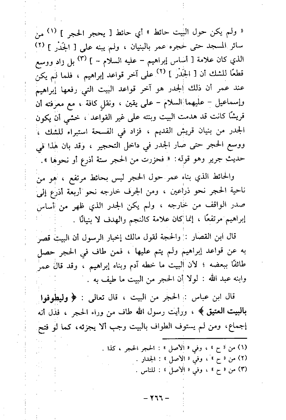 (ولم يكن حول البيت حائط) أى حائط يحجر الحجر من سائر المسجد حتى حجره عمر بالبنيان، ولم يبنه على الجَدْر الذى كان علامة أساس إبراهيم عليه السلام بل زاد ووسع قطعًا للشك أن الجَدْر هو آخر قواعد إبراهيم، فلما لم يكن عند عمر أن ذلك الجدر هو آخر قواعد البيت التى رفعها إبراهيم وإسماعيل، عليهما السلام، على يقين، ونقلِ كافة، مع معرفته أن قريشًا كانت قد هدمت البيت وبنته على غير القواعد، خشى أن يكون الجدر من بنيان قريش القديم، فزاد فى الفسحة استبراء للشك، ووسع الحجر حتى صار الجدر فى داخل التحجير، وقد بان هذا فى حديث جرير وهو قوله: (فحزرت من الحجر ستة أذرع أو نحوها) . والحائط الذى بناه عمر حول الحجر ليس بحائط مرتفع، وهو من ناحية الحجر نحو ذراعين، ومن الجرف خارجه نحو أربعة أذرع إلى صدر الواقف من خارجه، ولم يكن الجدر الذى ظهر من أساس إبراهيم مرتفعًا، إنما كان علامة كالنجم والهدف لا بنيانًا. قال ابن القصار: والحجة لقول مالك إخبار الرسول (صلى الله عليه وسلم) أن البيت قصر به عن قواعد إبراهيم ولم يتم عليها، فمن طاف فى الحجر حصل طائفًا ببعضه؛ لأن البيت ما خطه آدم وبناه إبراهيم، وقد قال عمر وابنه عبد الله: لولا أن الحجر من البيت ما طيف به. قال ابن عباس: الحجر من البيت، قال تعالى: (وَلْيَطَّوَّفُوا بِالْبَيْتِ الْعَتِيقِ (، ورأيت رسول الله (صلى الله عليه وسلم) طاف من وراء الحجر، فدل أنه إجماع، ومن لم يستوف الطواف بالبيت وجب ألا يجزئه، كما لو فتح