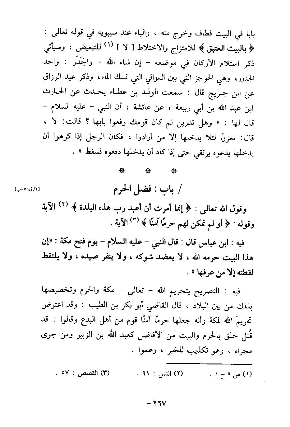 وَقَوْلِهِ تَعَالَى: (إِنَّمَا أُمِرْتُ أَنْ أَعْبُدَ رَبَّ هَذِهِ الْبَلْدَةِ (الآية [النمل: 91] ، وَقَوْلِهِ: (أَوَلَمْ نُمَكِّنْ لَهُمْ حَرَمًا آمِنًا (الآية [القصص: 57] . / 58 - فيه: ابْن عَبَّاس، قَالَ: قَالَ النَّبِىّ، عليه السَّلام، يَوْمَ فَتْحِ مَكَّةَ: (إِنَّ هَذَا الْبَلَدَ حَرَّمَهُ اللَّهُ، لا يُعْضَدُ شَوْكُهُ، وَلا يُنَفَّرُ صَيْدُهُ، وَلا يَلْتَقِطُ لُقَطَتَهُ إِلا مَنْ عَرَّفَهَا) . فيه: التصريح بتحريم الله تعالى مكة والحرم وتخصيصها بذلك من بين البلاد، قال القاضى أبو بكر بن الطيب: وقد اعترض تحريمَ الله لمكة وأنه جعلها حرمًا آمنًا قوم من أهل البدع وقالوا: قد قُتل خلق بالحرم والبيت من الأفاضل كعبد الله بن الزبير ومن جرى مجراه، وهو تكذيب للخبر، زعموا.