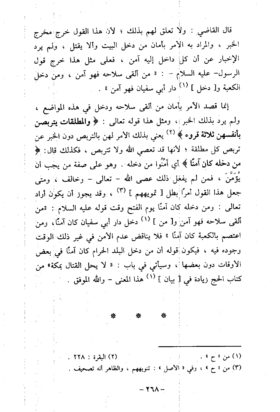 قال القاضى: ولا تعلق لهم بذلك؛ لأن هذا القول خرج مخرج الخبر، والمراد به الأمر بأمان من دخل البيت وألا يقتل، ولم يرد الإخبار عن أن كل داخل إليه آمن، فعلى مثل هذا خرج قول الرسول عليه السلام: (من ألقى سلاحه فهو آمن، ومن دخل الكعبة ودخل دار أبى سفيان فهو آمن) . إنما قصد الأمر بأمان من ألقى سلاحه ودخل فى هذه المواضع، ولم يرد بذلك الخبر، ومثل هذا قوله تعالى: (وَالْمُطَلَّقَاتُ يَتَرَبَّصْنَ بِأَنفُسِهِنَّ ثَلاَثَةَ قُرُوَءٍ) [البقرة: 228] يعنى بذلك الأمر لهن بالتربص دون الخبر عن تربص كل مطلقة؛ لأنها قد تعصى الله ولا تتربص، فكذلك قال: (وَمَن دَخَلَهُ كَانَ آمِنًا) [آل عمران: 97] ، أى أَمِّنُوا من دخله. وهو على صفة من يجب أن يُؤَمَّنَ، فمن لم يفعل ذلك عصى الله تعالى وخالف، ومتى جعل هذا القول أمرًا بطل تمويههم، وقد يجوز أن يكون أراد تعالى: ومن دخله كان آمنًا يوم الفتح وقت قوله عليه السلام: (من ألقى سلاحه فهو آمن ومن دخل دار أبى سفيان كان آمنًا، ومن اعتصم بالكعبة كان آمنًا) فلا يناقض عدم الأمن فى غير ذلك الوقت وجوده فيه، فيكون قوله أن من دخل البلد الحرام كان آمنًا فى بعض الأوقات دون بعضها، وسيأتى فى باب: (لا يحل القتال بمكة) من كتاب الحج زيادة فى بيان هذا المعنى والله الموفق.