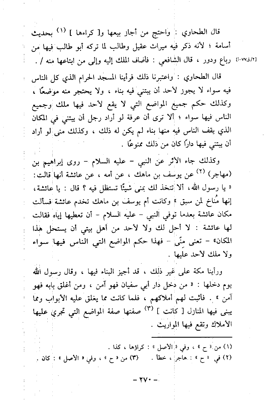 قال الطحاوى: واحتج من أجاز بيعها وكراءها بحديث أسامة؛ لأنه ذكر فيه ميراث عقيل وطالب لما تركه أبو طالب فيها من رباع ودور، قال الشافعى: فأضاف الملك إليه وإلى من ابتاعها منه. قال الطحاوى: واعتبرنا ذلك فرأينا المسجد الحرام الذى كل الناس فيه سواء لا يجوز لأحد أن يبتنى فيه بناء، ولا يحتجز منه موضعًا، وكذلك حكم جميع المواضع التى لا يقع لأحد فيها ملك وجميع الناس فيها سواء؛ ألا ترى أن عرفة لو أراد رجل أن يبتنى فى المكان الذى يقف الناس فيه منها بناء لم يكن له ذلك، وكذلك نى لو أراد أن يبتنى فيها دارًا كان من ذلك ممنوعًا. وكذلك جاء الأثر عن النبى عليه السلام روى إبراهيم بن مهاجر عن يوسف بن ماهك، عن أمه، عن عائشة أنها قالت: (يا رسول الله، ألا تتخذ لك بمنى شيئًا تستظل فيه؟ قال: (يا عائشة، إنها مُناخ لمن سبق) وكانت أم يوسف بن ماهك تخدم عائشة فسألت مكان عائشة بعدما توفى النبى عليه السلام أن تعطيها إياه فقالت لها عائشة: لا أحل لك ولا لأحد من أهل بيتى أن يستحل هذا المكان) ، تعنى مِنىً، فهذا حكم المواضع التى الناس فيها سواء ولا ملك لأحد عليها. ورأينا مكة على غير ذلك، قد أجيز البناء فيها، وقال رسول الله (صلى الله عليه وسلم) يوم دخلها: (من دخل دار أبى سفيان فهو آمن، ومن أغلق بابه فهو آمن) . فأثبت لهم أملاكهم، فلما كانت مما يغلق عليه الأبواب ومما يبنى فيها المنازل كانت صفتها صفة المواضع التى تجرى عليها الأملاك وتقع فيها المواريث.