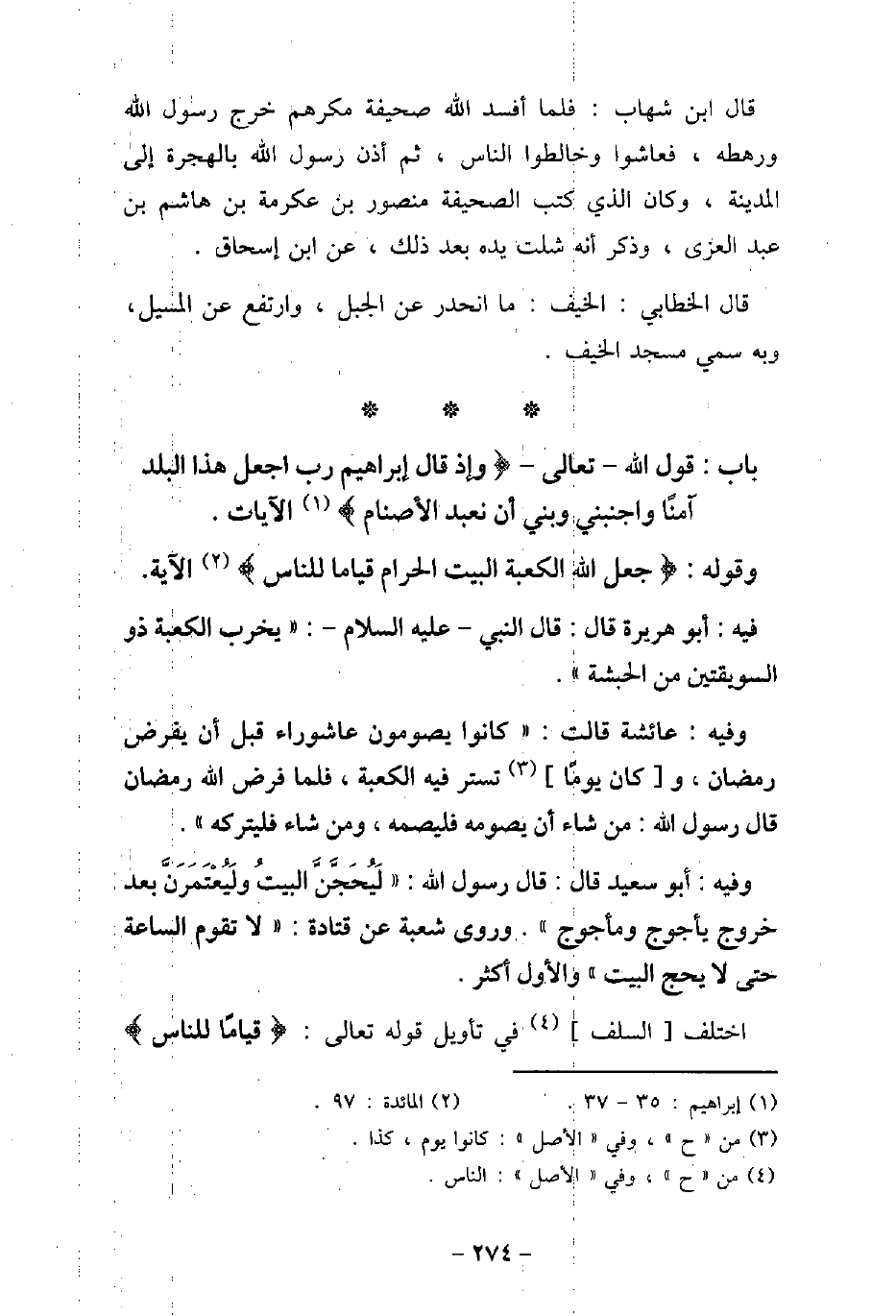 وقوله: (جَعلَ اللهُ الكعبةَ البيتَ الحَرامَ قِيامًا للناسِ (الآية [المائدة: 97] . / 61 - فيه: أَبُو هُرَيْرَةَ، قَالَ النَّبِىّ، عليه السَّلام: (يُخَرِّبُ الْكَعْبَةَ ذُو السُّوَيْقَتَيْنِ مِنَ الْحَبَشَةِ) . / 62 - وفيه: عَائِشَةَ، كَانُوا يَصُومُونَ عَاشُورَاءَ قَبْلَ أَنْ يُفْرَضَ رَمَضَانُ، وَكَانَ يَوْمًا تُسْتَرُ فِيهِ الْكَعْبَةُ، فَلَمَّا فَرَضَ اللَّهُ رَمَضَانَ قَالَ رَسُولُ اللَّهِ (صلى الله عليه وسلم) : (مَنْ شَاءَ أَنْ يَصُومَهُ فَلْيَصُمْهُ، وَمَنْ شَاءَ فَلْيَتْرُكْهُ) . / 63 - وفيه: أَبُو سَعِيد، قَالَ: قَالَ رسُولُ اللَّه (صلى الله عليه وسلم) : (لَيُحَجَّنَّ الْبَيْتُ وَلَيُعْتَمَرَنَّ بَعْدَ خُرُوجِ يَأْجُوجَ وَمَأْجُوجَ) . وروى شُعْبَةَ، عن قَتَادَة: (لا تَقُومُ السَّاعَةُ حَتَّى لا يُحَجَّ الْبَيْتُ) ، وَالأوَّلُ أَكْثَرُ. اختلف السلف فى تأويل قوله تعالى: (قِيامًا للناسِ (