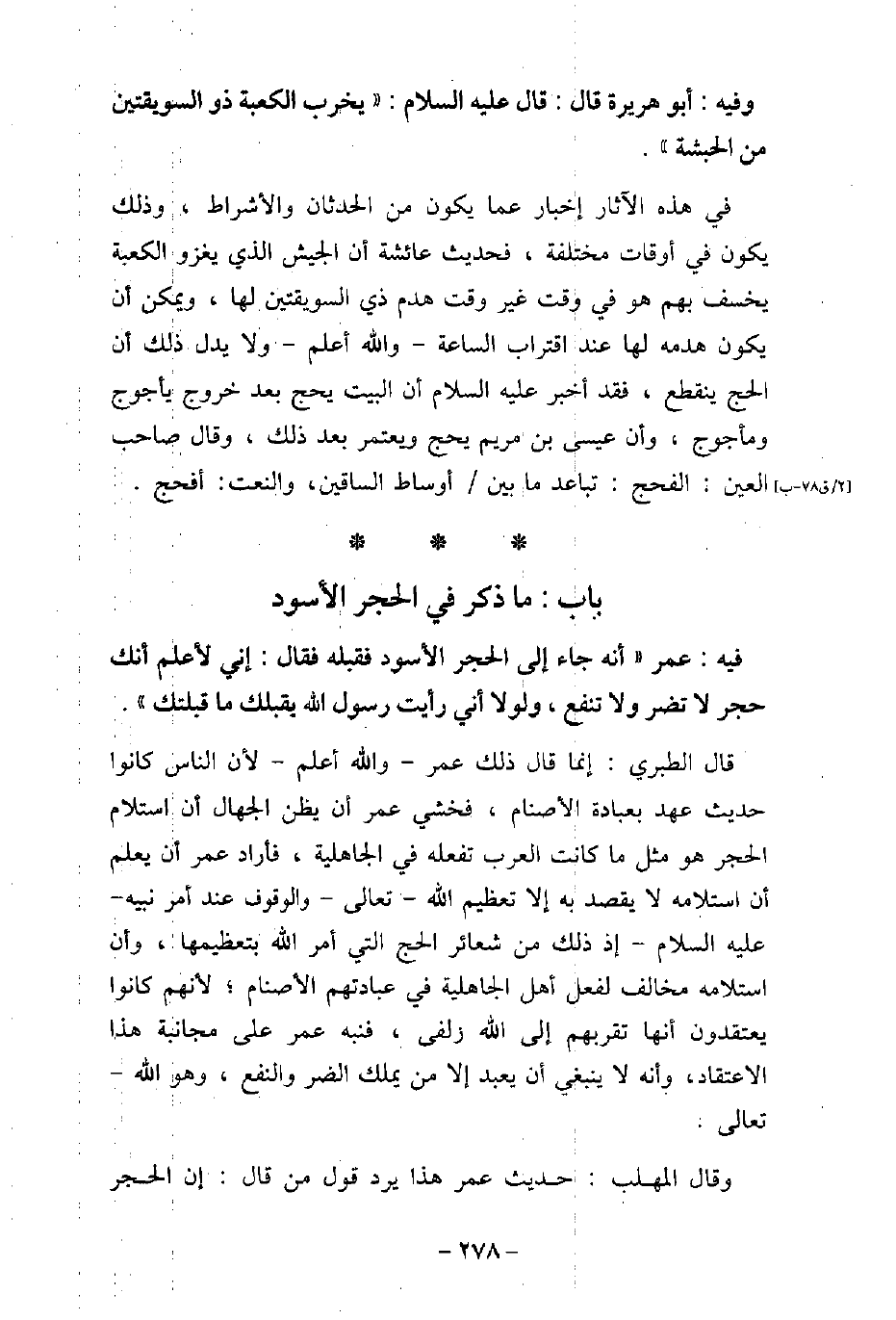 / 67 - وفيه: أَبُو هُرَيْرَةَ، قَالَ: قَالَ، عليه السَّلام: (يُخَرِّبُ الْكَعْبَةَ ذُو السُّوَيْقَتَيْنِ مِنَ الْحَبَشَةِ) . فى هذه الآثار إخبار عما يكون من الحدثان والأشراط، وذلك يكون فى أوقات مختلفة، فحديث عائشة أن الجيش الذى يغزو الكعبة يخسف بهم هو فى وقت غير وقت هدم ذى السويقتين لها، ويمكن أن يكون هدمه لها عند اقتراب الساعة والله أعلم، ولا يدل ذلك أن الحج ينقطع؛ فقد أخبر عليه السلام أن البيت يحج بعد خروج يأجوج ومأجوج، وأن عيسى ابن مريم يحج ويعتمر بعد ذلك، وقال صاحب العين: الفحج: تباعد ما بين أوساط الساقين، والنعت: أفحج.