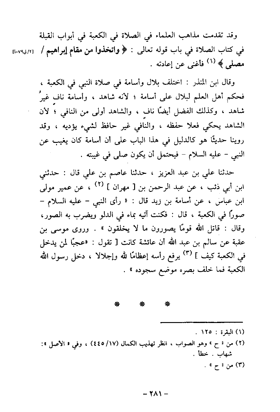 وقد تقدمت مذاهب العلماء فى الصلاة فى الكعبة فى أبواب القبلة فى كتاب الصلاة فى باب قوله تعالى: (وَاتَّخِذُوا مِن مَّقَامِ إِبْرَاهِيمَ مُصَلًّى) [البقرة: 125] فأغنى عن إعادته. وقال ابن المنذر: اختلف بلال وأسامة فى صلاة النبى (صلى الله عليه وسلم) فى الكعبة، فحكم أهل العلم لبلال على أسامة؛ لأنه شاهد، وأسامة نافٍ غيرُ شاهد، وكذلك الفضل أيضًا نافٍ، والشاهد أولى من النافى؛ لأن الشاهد يحكى فعلا حفظه، والنافى غير حافظ لشىء يؤديه، وقد روينا حديثًا هو كالدليل فى هذا الباب على أن أسامة كان يغيب عن النبى عليه السلام فيحتمل أن يكون صلى فى غيبته. حدثنا على بن عبد العزيز، حدثنا عاصم بن على قال: حدثنى ابن أبى ذئب، عن عبد الرحمن بن مهران، عن عمير مولى ابن عباس، عن أسامة بن زيد قال: (رأى النبى عليه السلام صورًا فى الكعبة، قال: فكنت آتية بماء فى الدلو ويضرب به الصور، وقال: قاتل الله قومًا يصورون ما لا يخلقون) . وروى موسى بن عقبة عن سالم بن عبد الله أن عائشة كانت تقول: (عجبًا لمن يدخل فى الكعبة كيف يرفع رأسه إعظامًا لله وإجلالاً، دخل رسول الله (صلى الله عليه وسلم) الكعبة فما خلف بصره موضع سجوده) .