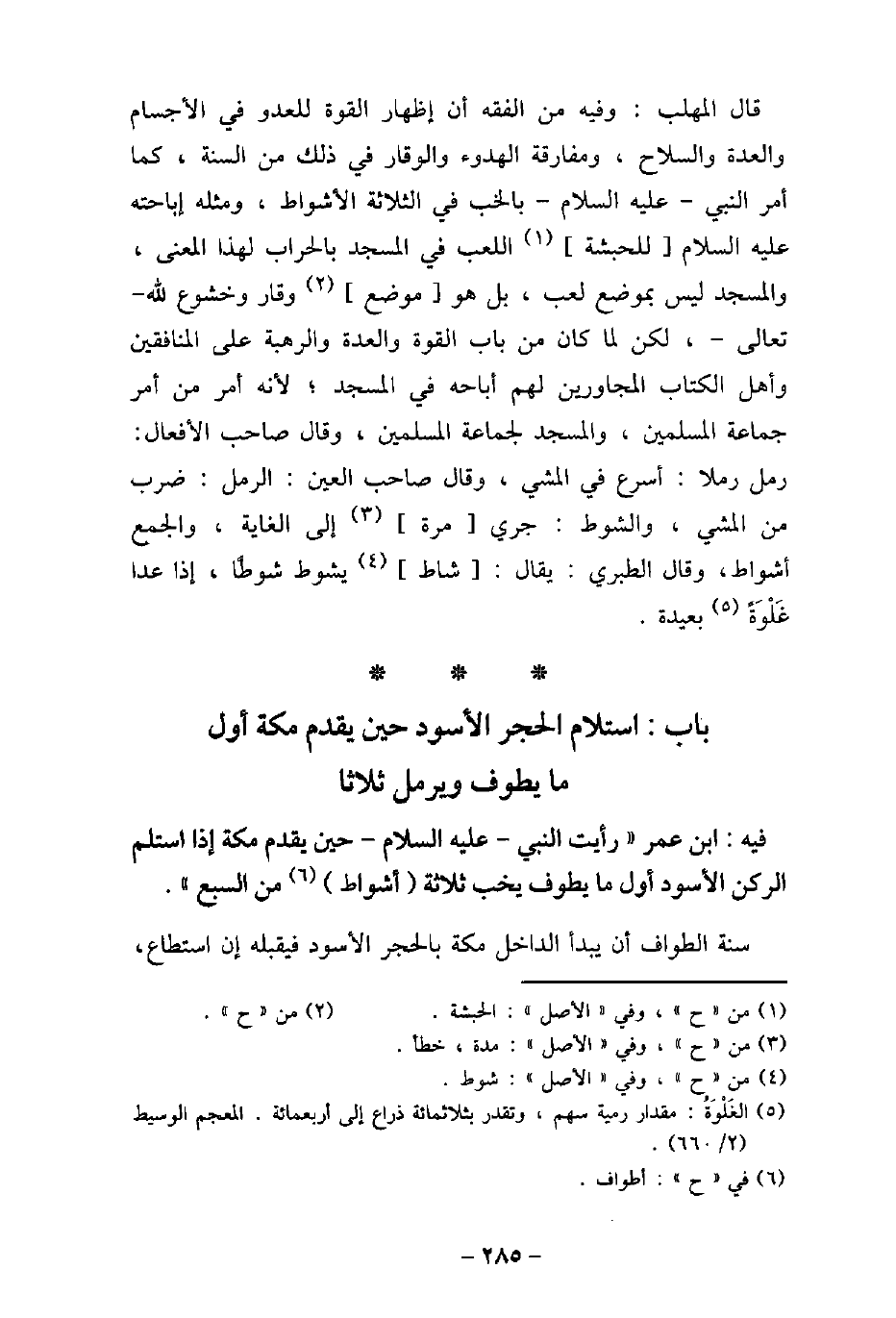 قال المهلب: وفيه من الفقه أن إظهار القوة للعدو فى الجسام والعدة والسلاح، ومفارقة الهدوء والوقار فى ذلك من السنة، كما أمر النبى عليه السلام بالخب فى الثلاثة الأشواط، ومثله إباحته عليه السلام للحبشة اللعب فى المسجد بالحراب لهذا المعنى، والمسجد ليس بموضع لعب، بل هو موضع وقار وخشوع لله تعالى، لكن لما كان من باب القوة والعدة والرهبة على المنافقين وأهل الكتاب المجاورين لهم أباحه فى المسجد؛ لأنه أمر من امر جماعة المسلمين، والمسجد الجماعة المسلمين، وقال صاحب الأفعال: رمل رملا: أسرع فى المشى، وقال صاحب العين: الرمل: ضرب من المشى، والشوط: جرى مرة إلى الغاية، والجمع أشواط، وقال الطبرى: يقال: شاط يشوط شوطًا، إذا عدا غَلْوَةً بعيدة.