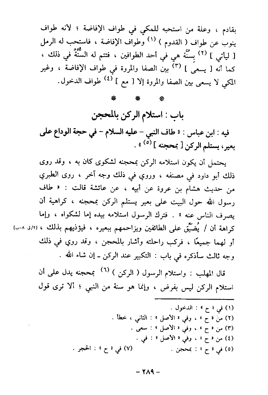 / 78 - فيه: ابْن عَبَّاس، طَافَ النَّبِىُّ، عليه السَّلام، فِى حَجَّةِ الْوَدَاعِ عَلَى بَعِيرٍ، يَسْتَلِمُ الرُّكْنَ بِمِحْجَنٍ. يحتمل أن يكون استلامه الركن بمحجنه لشكوى كان به، وقد روى ذلك أبو داود فى مصنفه، وروى فى ذلك وجه آخر، وروى الطبرى من حديث هشام بن عروة عن أبيه، عن عائشة قالت: (طاف رسول الله (صلى الله عليه وسلم) حول البيت على بعير يستلم الركن بمحجنه، كراهية أن يصرف الناس عنه) . فترك الرسول (صلى الله عليه وسلم) استلامه بيده إما لشكواه، وإما كراهة أن يُضَيِّق على الطائفين ويزاحمهم ببعيره، فيؤذيهم بذلك، أو لهما جميعًا، فركب راحلته وأشار بالمحجن، وقد روى فى ذلك وجه ثالث سأذكره فى باب: التكبير عند الركن إن شاء الله. قال المهلب: واستلام الرسول (صلى الله عليه وسلم) الركن بمحجنه يدل على أن استلام الركن ليس بفرض، وإنما هو سنة من النبى (صلى الله عليه وسلم) ؛ ألا ترى قول