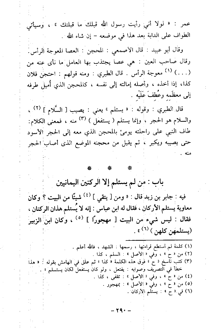 عمر: (لولا أنى رأيت رسول الله (صلى الله عليه وسلم) قبلك ما قبلتك) ، وسيأتى الطواف على الدابة بعد هذا فى موضعه إن شاء الله. وقال أبو عبيد: قال الأصمعى: المحجن: العصا المعوجة الرأس. وقال صاحب العين: هى عصا يجتذب بها العامل ما نأى عنه من [. . . . . .] معوجة الرأس. قال الطبرى: ومنه قولهم: احتجن فلان كذا، إذا أخذه، وأصله إمالته إلى نفسه، كالمحجن الذى أُميل طرفه إلى معظَمِهِ وعُطِفَ عَلَيْهِ. قال الطبرى: وقوله: (يستلم) يعنى: يصيب السَّلام، والسلام هو الحجر، وإنما يستلم يستفعل منه، فمعنى الكلام: طاف النبى (صلى الله عليه وسلم) على راحلته يومئ بالمحجن الذى معه إلى الحجر الأسود حتى يصيبه ويكبر، ثم يقبل من محجنه الموضع الذى أصاب الحجر منه.