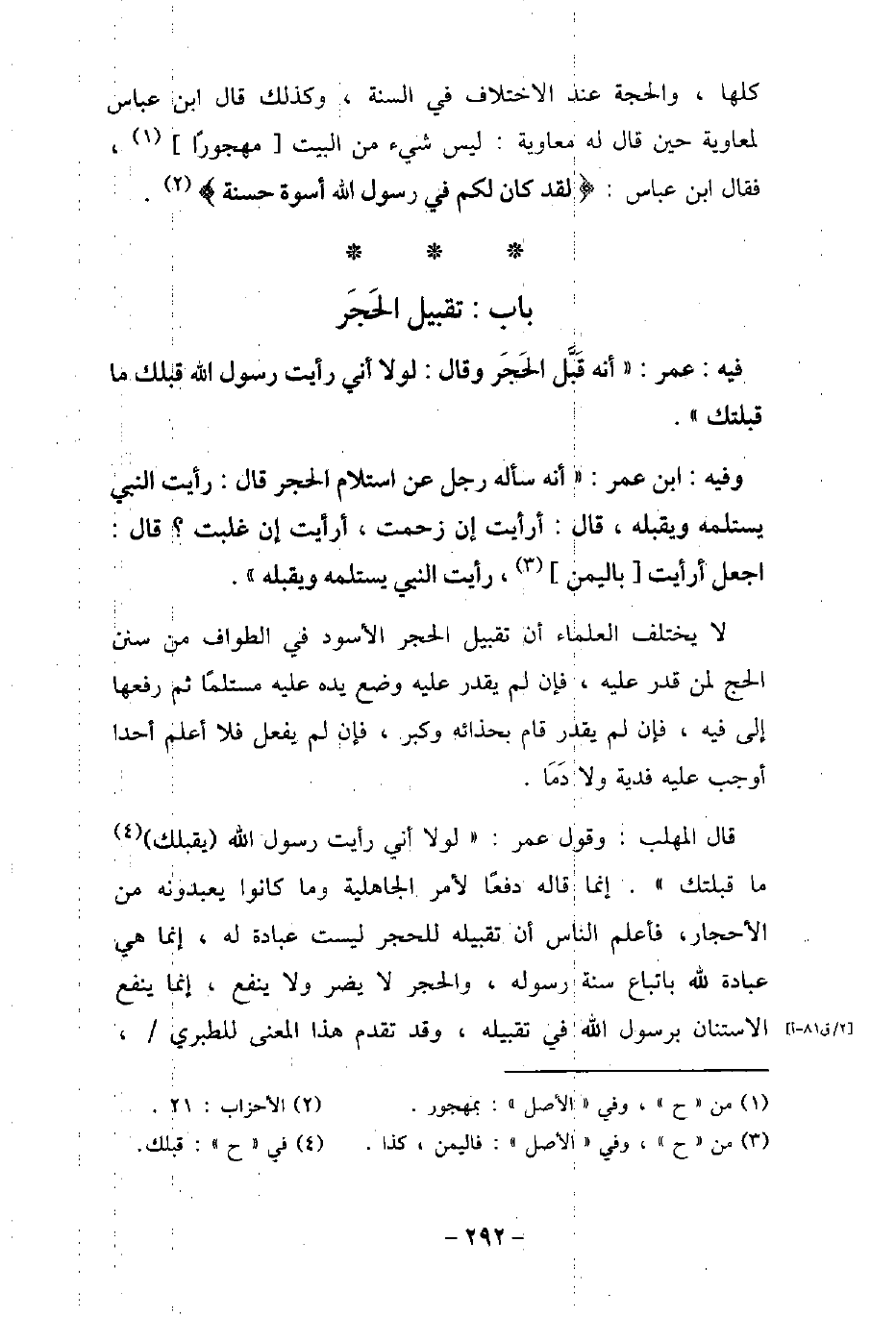/ 81 - فيه: عُمَرَ أَنَّهُ قَبَّلَ الْحَجَرَ، وَقَالَ: لَوْلا أَنِّى رَأَيْتُ رَسُولَ اللَّهِ (صلى الله عليه وسلم) قَبَّلَكَ مَا قَبَّلْتُكَ. / 82 - وفيه: ابْن عُمَرَ، أنَّهُ سَأل رجل عَنِ اسْتِلامِ الْحَجَرِ، فَقَالَ: رَأَيْتُ النَّبِىّ (صلى الله عليه وسلم) يَسْتَلِمُهُ وَيُقَبِّلُهُ، قَالَ: أَرَأَيْتَ إِنْ زُحِمْتُ، أَرَأَيْتَ إِنْ غُلِبْتُ؟ قَالَ: اجْعَلْ أَرَأَيْتَ بِالْيَمَنِ، رَأَيْتُ النَّبِىّ (صلى الله عليه وسلم) يَسْتَلِمُهُ وَيُقَبِّلُهُ. لا يختلف العلماء أن تقبيل الحجر الأسود فى الطواف من سنن الحج لمن قدر عليه، فإن لم يقدر عليه وضع يده عليه مستلمًا ثم رفعها إلى فيه، فإن لم يقدر قام بحذائه وكبر، فإن لم يفعل فلا أعلم أحدا أوجب عليه فدية ولا دَمَا. قال المهلب: وقول عمر: (لولا أنى رأيت رسول الله (صلى الله عليه وسلم) يقبلك ما قبلتك) . إنما قاله دفعًا لأمر الجاهلية وما كانوا يعبدونه من الأحجار، فأعلم الناس أن تقبيله للحجر ليست عبادة له، إنما هى عبادة لله باتباع سنة رسوله، والحجر لا يضر ولا ينفع، إنما ينفع الاستتان برسول الله (صلى الله عليه وسلم) فى تقبيله، وقد تقدم هذا المعنى للطبرى،