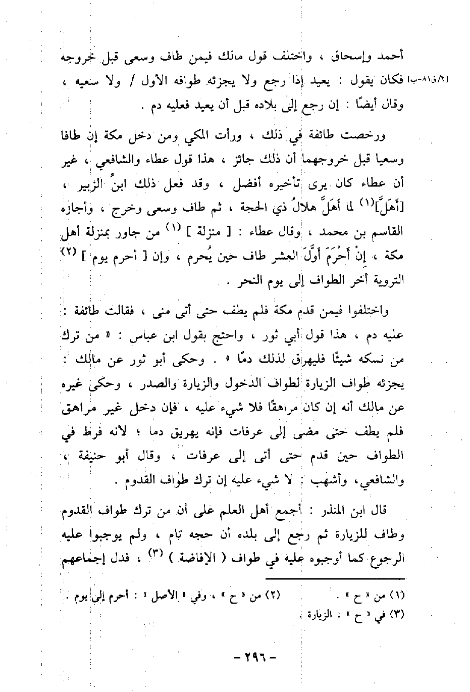 أحمد وإسحاق، واختلف قول مالك فيمن طاف وسعى قبل خروجه فكان يقول: يعيد إذا رجع ولا يجزئه طوافه الأول ولا سعيه، وقال أيضًا: إن رجع إلى بلاده قبل أن يعيد فعليه دم. ورخصت طائفة فى ذلك، ورأت المكى ومن دخل مكة إن طفا وسعيا قبل خروجهما أن ذلك جائز، هذا قول عطاء والشافعى، غير أن عطاء كان يرى تأخيره أفضل، وقد فعل ذلك ابنُ الزبير، أَهَلَّ لما أَهَلَّ هلالُ ذى الحجة، ثم طاف وسعى وخرج، وأجازه القاسم بن محمد، وقال عطاء: منزلة من جاور بمنزلة أهل مكة، إِنْ أَحْرَمَ أَوَّلَ العشر طاف حين يُحرم، وإن أحرم يوم التروية أخر الطواف إلى يوم النحر. واختلفوا فيمن قدم مكة فلم يطف حتى أتى منى، فقالت طائفة: عليه دم، هذا قول أبى ثور، واحتج بقول ابن عباس: (من ترك من نسكه شيئًا فليهرق لذلك دمًا) . وحكى أبو ثور عن مالك: يجزئه طواف الزيارة لطواف الدخول والزيارة والصدر، وحكى غيره عن مالك أنه إن كان مراهقًا فلا شىء عليه، فإن دخل غير مراهق فلم يطف حتى مضى إلى عرفات فإنه يهريق دما؛ لأنه فرط فى الطواف حين قدم حتى أتى إلى عرفات، وقال أبو حنيفة، والشافعى، وأشهب: لا شىء عليه إن ترك طواف القدوم. قال ابن المنذر: أجمع أهل العلم على أن من ترك طواف القدوم وطاف للزيارة ثم رجع إلى بلده أن حجه تام، ولم يوجبوا عليه الرجوع كما أوجبوه عليه فى طواف الإفاضة، فدل إجماعهم