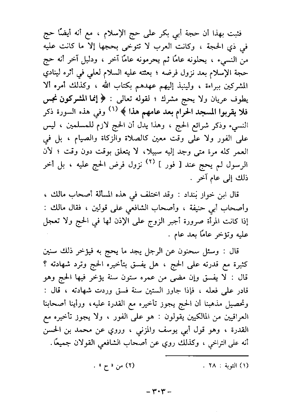 فثبت بهذا أن حجة أبى بكر على حج الإسلام، مع أنه أيضًا حج فى ذى الحجة، وكانت العرب لا تتوخى بحجها إلا ما كانت عليه من النسئ، يحلونه عامًا ثم يحرمونه عامًا آخر، ودليل آخر أنه حج حجة الإسلام بعد نزول فرضه؛ بعثته عليه السلام لعلى فى أثره لينادى المشركين ببراءة، ولينبذ إليهم عهدهم بكتاب الله، وكذلك أمره ألا يطوف عريان ولا يحج مشرك؛ لقوله تعالى: (إِنَّمَا الْمُشْرِكُونَ نَجَسٌ فَلاَ يَقْرَبُوا الْمَسْجِدَ الْحَرَامَ بَعْدَ عَامِهِمْ هَذَا) [التوبة: 28] وفى هذه السورة ذكر النسئ وذكر شرائع الحج، وهذا يدل أن الحج لازم للمسلمين، ليس على الفور ولا على وقت معين كالصلاة والزكاة والصيام، بل فى العمر كله مرة متى وجد إليه سبيلا، لا يتعلق بوقت دون وقت؛ لأن الرسول (صلى الله عليه وسلم) لم يحج بعد فور نزول فرض الحج عليه، بل أخر ذلك إلى عام آخر. قال ابن خواز بنداد: وقد اختلف فى هذه المسألة أصحاب مالك: وأصحاب أبى حنيفة، وأصحاب الشافعى على قولين، فقال مالك: إذا كانت المرأة صرورة أجبر الزوج على الإذن لها فى الحج ولا تعجل عليه وتؤخر عامًا بعد عام. قال: وسئل سحنون عن الرجل يجد ما يحج به فيؤخر ذلك سنين كثيرة مع قدرته على الحج، هل يفسق بتأخيره الحج وترد شهادته؟ قال: لا يفسق وإن مضى من عمره ستون سنة يؤخر فيها الحج وهو قادر على فعله، فإذا جاوز الستين سنة فسق وردت شهادته، قال: وتحصيل مذهبنا أن الحج تأخيره مع القدرة عليه، ورأينا أصحابنا العراقيين من المالكيين يقولون: هو على الفور، ولا يجوز تأخيره مع القدرة، وهو قول أبى يوسف والمزنى، وروى عن محمد بن الحسن أنه على التراخى، وكذلك روى عن أصحاب الشافعى القولان جميعًا.