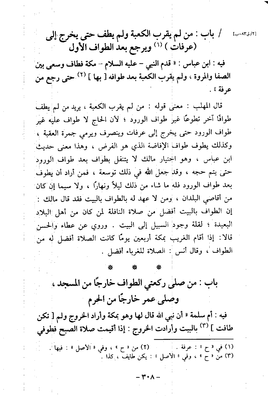 / 91 - فيه: ابْن عَبَّاس، قَدِمَ النَّبِىُّ، عليه السَّلام، مَكَّةَ فَطَافَ وَسَعَى بَيْنَ الصَّفَا وَالْمَرْوَةِ، وَلَمْ يَقْرَبِ الْكَعْبَةَ بَعْدَ طَوَافِهِ بِهَا، حَتَّى رَجَعَ مِنْ عَرَفَةَ. قال المهلب: معنى قوله: من لم يقرب الكعبة، يريد من لم يطف طوافًا آخر تطوعًا غير طواف الورود؛ لأن الحاج لا طواف عليه غير طواف الورود حتى يخرج إلى عرفات وينصرف ويرمى جمرة العقبة، وكذلك يطوف طواف الإفاضة الذى هو الفرض، وهذا معنى حديث ابن عباس، وهو اختيار مالك لا ينتقل بطواف بعد طواف الورود حتى يتم حجه، وقد جعل الله فى ذلك توسعة، فمن أراد أن يطوف بعد طواف الورود فله ما شاء من ذلك ليلاً ونهارًا، ولا سيما إن كان من أقاصى البلدان، ومن لا عهد به بالطواف بالبيت فقد قال مالك: إن الطواف بالبيت أفضل من صلاة النافلة لمن كان من أهل البلاد البعيدة؛ لقلة وجود السبيل إلى البيت. وروى عن عطاء والحسن قالا: إذا أقام الغريب بمكة أربعين يومًا كانت الصلاة أفضل له من الطواف، وقال أنس: الصلاة للغرباء أفضل.