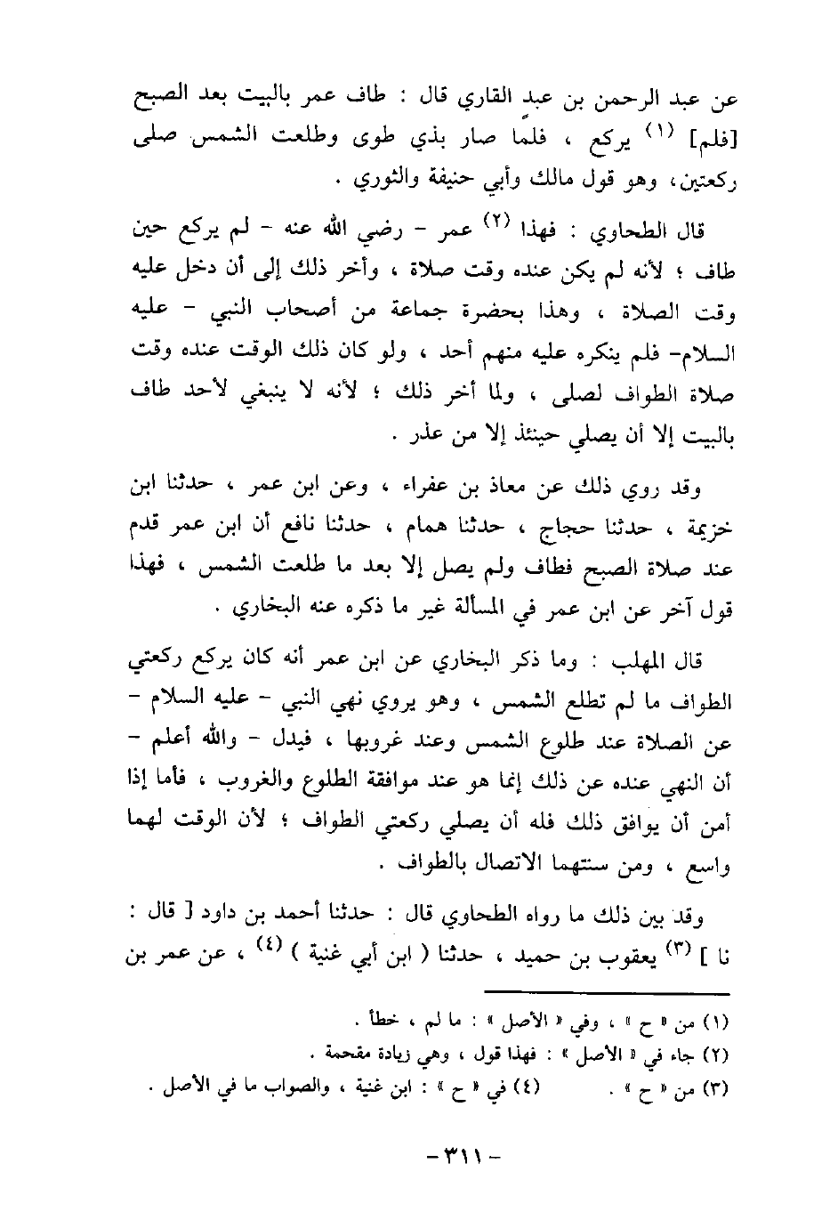 عن عبد الرحمن بن عبد القارى قال: طاف عمر بالبيت بعد الصبح فلم يركع، فلما صار بذى طوى وطلعت الشمس صلى ركعتين، وهو قول مالك وأبى حنيفة والثورى. قال الطحاوى: فهذا عمر، رضى الله عنه، لم يركع حين طاف؛ لأنه لم يكن عنده وقت صلاة، وأخر ذلك إلى أن دخل عليه وقت الصلاة، وهذا بحضرة جماعة من أصحاب النبى عليه السلام فلم ينكره عليه منهم أحد، ولو كان ذلك الوقت عنده وقت صلاة الطواف لصلى، ولما أخر ذلك؛ لأنه لا ينبغى لأحد طاف بالبيت إلا أن يصلى حينئذ إلا من عذر. وقد روى ذلك عن معاذ بن عفراء، وعن ابن عمر، حدثنا ابن خزيمة، حدثنا حجاج، حدثنا همام، حدثنا نافع: أن ابن عمر قدم عند صلاة الصبح فطاف ولم يصل إلا بعد ما طلعت الشمس، فهذا قول آخر عن ابن عمر فى المسألة غير ما ذكره عنه البخارى. قال المهلب: وما ذكره البخارى عن ابن عمر أنه كان يركع ركعتى الطواف ما لم تطلع الشمس، وهو يروى نهى النبى عليه السلام عن الصلاة عند طلوع الشمس وعند غروبها، فيدل والله أعلم أن النهى عنده عن ذلك إنما هو عند موافقة الطلوع والغروب، فأما إذا أمن أن يوافق ذلك فله أن يصلى ركعتى الطواف؛ لأن الوقت لهما واسع، ومن سنتهما الاتصال بالطواف. وقد بين ذلك ما رواه الطحاوى قال: حدثنا أحمد بن داود قال: نا يعقوب بن حميد، حدثنا ابن أبى غنية، عن عمر بن