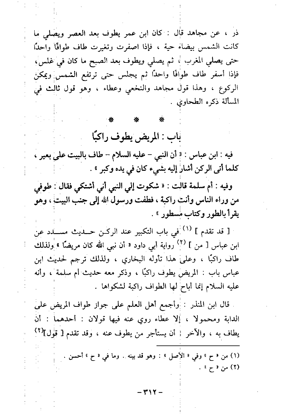 ذر، عن مجاهد قال: كان ابن عمر يطوف بعد العصر ويصلى ما كانت الشمس بيضاء حية، فإذا اصفرت وتغيرت طاف طوافًا واحدًا حتى يصلى المغرب، ثم يصلى ويطوف بعد الصبح ما كان فى غلس، فإذا أسفر طاف طوافًا واحدًا ثم يجلس حتى ترتفع الشمس ويمكن الركوع، وهذا قول مجاهد والنخعى وعطاء، وهو قول ثالث فى المسألة ذكره الطحاوى.