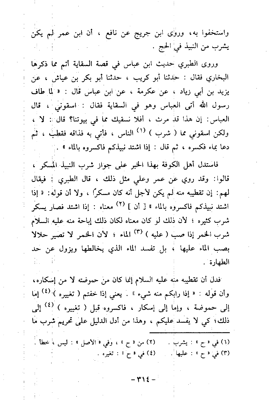 واستخفوا به، وروى ابن جريج عن نافع، أن ابن عمر لم يكن يشرب من النبيذ فى الحج. وروى الطبرى حديث ابن عباس فى قصة السقاية أتم مما ذكرها البخارى فقال: حدثنا أبو كريب، حدثنا أبو بكر بن عياش، عن يزيد بن أبى زياد، عن عكرمة، عن ابن عباس قال: (لما طاف رسول الله (صلى الله عليه وسلم) أتى العباس وهو فى السقاية فقال: (اسقونى) ، قال العباس: إن هذا قد مرث، أفلا نسقيك مما فى بيوتنا؟ قال: (لا، ولكن اسقونى مما شرب الناس) ، فأتى به فذاقه فقطب، ثم دعا بماء فكسره، ثم قال: (إذا اشتد نبيذكم فاكسروه بالماء) . فاستدل أهل الكوفة بهذا الخبر على جواز شرب المسكر، قالوا: وقد روى عن عمر وعلى مثل ذلك. قال الطبرى: فيقال لهم: إن تقطيبه منه لم يكن لأجل أنه كان مسكرًا، ولا أن قوله: (إذا اشتد نبيذكم فاكسروا بالماء) أن معناه: إذا اشتد فصار يسكر شرب كثيره؛ لأن ذلك لو كان معناه لكان ذلك إباحة منه عليه السلام شرب الخمر إذا صب عليه الماء؛ لأن الخمر لا تصير حلالا بصب الماء عليها، بل تفسد الماء الذى يخالطها ويزول عن حد الطهارة. فدل أن تقطيبه منه عليه السلام إنما كان من حموضته لا من إسكاره، وأن قوله: (إذا رابكم منه شىء) . يعنى إذا خفتم تغييره إما إلى حموضة، وإما إلى إسكار، فاكسروه قبل تغييره إلى ذلك؛ كى لا يفسد عليكم، وهذا من أدل الدليل على تحريم شرب ما