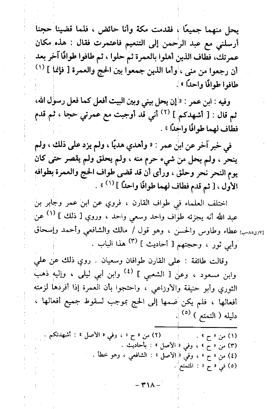 يَحِلَّ مِنْهُمَا) ، فَقَدِمْتُ مَكَّةَ وَأَنَا حَائِضٌ، فَلَمَّا قَضَيْنَا حَجَّنَا، أَرْسَلَنِى مَعَ عَبْدِالرَّحْمَنِ إِلَى التَّنْعِيمِ، فَاعْتَمَرْتُ، فَقَالَ (صلى الله عليه وسلم) : (هَذِهِ مَكَانَ عُمْرَتِكِ) ، فَطَافَ الَّذِينَ أَهَلُّوا بِالْعُمْرَةِ، ثُمَّ حَلُّوا ثُمَّ طَافُوا طَوَافًا آخَرَ بَعْدَ أَنْ رَجَعُوا مِنْ مِنًى، وَأَمَّا الَّذِينَ جَمَعُوا بَيْنَ الْحَجِّ وَالْعُمْرَةِ، فَإِنَّمَا طَافُوا طَوَافًا وَاحِدًا. / 103 - وفيه: ابْنَ عُمَرَ، إِنْ حِيلَ بَيْنِى وَبَين الْبَيْتَ أَفْعَلُ كَمَا فَعَلَ رَسُولُ اللَّهِ (صلى الله عليه وسلم) ، ثُمَّ قَالَ: (أُشْهِدُكُمْ أَنِّى قَدْ أَوْجَبْتُ مَعَ عُمْرَتِى حَجًّا) ، ثُمَّ قَدِمَ، فَطَافَ لَهُمَا طَوَافًا وَاحِدًا. / 104 - وفيه: خبر آخر عن ابْن عُمَرَ، وَأَهْدَى هَدْيًا، وَلَمْ يَزِدْ عَلَى ذَلِكَ، فَلَمْ يَنْحَرْ وَلَمْ يَحِلَّ مِنْ شَىْءٍ حَرُمَ مِنْهُ، وَلَمْ يَحْلِقْ، وَلَمْ يُقَصِّرْ، حَتَّى كَانَ يَوْمُ النَّحْرِ فَنَحَرَ، وَحَلَقَ، وَرَأَى أَنْ قَدْ قَضَى طَوَافَ الْحَجِّ وَالْعُمْرَةِ بِطَوَافِهِ الأوَّلِ، ثُمَّ قام لهما طوافًا واحدًا. اختلف العلماء فى طواف القارن، فروى عن ابن عمر وجابر بن عبد الله أنه يجزئه طواف واحد وسعى واحد، وروى ذلك عن عطاء وطاوس والحسن، وهو قول مالك والشافعى وأحمد وإسحاق وأبى ثور، وحجتهم أحاديث هذا الباب. وقالت طائفة: على القارن طوافان وسعيان. روى ذلك عن على وابن مسعود، وعن الشعبى وابن أبى ليلى، وإليه ذهب الثورى وأبو حنيفة والأوزاعى، واحتجوا بأن العمرة إذا أفردها لزمته أفعالها، فلم يكن ضمها إلى الحج بموجب لسقوط جميع أفعالها، دليله التمتع.