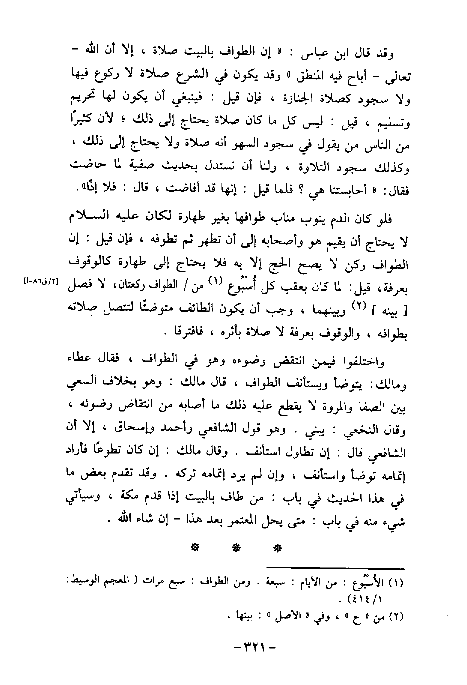 وقد قال ابن عباس: (إن الطواف بالبيت صلاة، إلا أن الله تعالى أباح فيه المنطق) وقد يكون فى الشرع صلاة لا ركوع فيها ولا سجود كصلاة الجنازة، فإن قيل: فينبغى أن يكون لها تحريم وتسليم، قيل: ليس كل ما كان صلاة يحتاج إلى ذلك؛ لأن كثيرًا من الناس من يقول فى سجود السهو أنه صلاة ولا يحتاج إلى ذلك، وكذلك سجود التلاوة، ولنا أن نستدل بحديث صفية لما حاضت فقال: (أحابستنا هى؟ فلما قيل: إنها قد أفاضت، قال: فلا إذاَ) . فلو كان الدم ينوب مناب طوافها بغير طهارة لكان عليه السلام لا يحتاج أن يقيم هو وأصحابه إلى أن تطهر ثم تطوفه، فإن قيل: إن الطواف ركن لا يصح الحج إلا به فلا يحتاج إلى طهارة كالوقوف بعرفة، قيل: لما كان يعقب كل أُسْبُوع من الطواف ركعتان، لا فصل بينه وبينهما، وجب أن يكون الطائف متوضئًا لتتصل صلاته بطوافه، والوقوف بعرفة لا صلاة بأثره، فافترقا. واختلفوا فيمن انتقض وضوءه وهو فى الطواف، فقال عطاء ومالك: يتوضأ ويستأنف الطواف، قال مالك: وهو بخلاف السعى بين الصفا والمروة لا يقطع عليه ذلك ما أصابه من انتقاض وضوئه، وقال النخعى: يبنى. وهو قول الشافعى وأحمد وإسحاق، إلا أن الشافعى قال: إن تطاول استأنف. وقال مالك: إن كان تطوعًا فأراد إتمامه توضأ واستأنف، وإن لم يرد إتمامه تركه. وقد تقدم بعض ما فى هذا الحديث فى باب: من طاف بالبيت إذا قدم مكة، وسيأتى شىء منه فى باب: متى يحل المعتمر بعد هذا إن شاء الله.