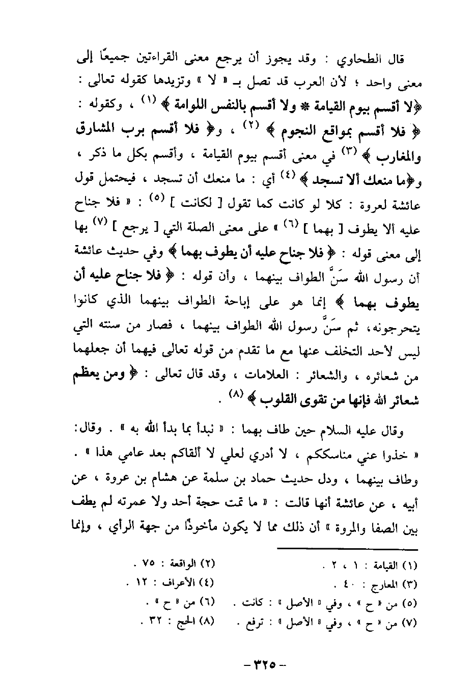 قال الطحاوى: وقد يجوز أن يرجع معنى القراءتين جميعًا إلى معنى واحد؛ لأن العرب قد تصل ب (لا) وتزيدها كقوله تعالى: (لاَ أُقْسِمُ بِيَوْمِ الْقِيَامَةِ وَلاَ أُقْسِمُ بِالنَّفْسِ اللَّوَّامَةِ) [القيامة: 1، 2] ، وكقوله: (فَلاَ أُقْسِمُ بِمَوَاقِعِ النُّجُومِ) [الواقعة: 75] ، و) فَلاَ أُقْسِمُ بِرَبِّ الْمَشَارِقِ وَالْمَغَارِبِ) [المعارج: 40] فى معنى أقسم بيوم القيامة، وأقسم بكل ما ذكر، و) مَا مَنَعَكَ أَلاَّ تَسْجُدَ) [الأعراف: 12] أى: ما منعك أن تسجد، فيحتمل قول عائشة لعروة: كلا لو كانت كما تقول لكانت: (فلا جناح عليه ألا يطوف بهما) على معنى الصلة التى يرجع بها إلى معنى قوله: (فَلاَ جُنَاحَ عَلَيْهِ أَن يَطَّوَّفَ بِهِمَا) [البقرة: 158] وفى حديث عائشة أن رسول الله (صلى الله عليه وسلم) سَنَّ الطواف بينهما، وأن قوله: (فَلاَ جُنَاحَ عَلَيْهِ أَن يَطَّوَّفَ بِهِمَا (إنما هو على إباحة الطواف بينهما الذى كانوا يتحرجونه، ثم سَنَّ رسول الله (صلى الله عليه وسلم) الطواف بينهما، فصار من سنته التى ليس لأحد التخلف عنها مع ما تقدم من قوله تعالى فيهما أن جعلهما من شعائره، والشعائر: العلامات، وقد قال تعالى: (وَمَن يُعَظِّمْ شَعَائِرَ اللَّهِ فَإِنَّهَا مِن تَقْوَى الْقُلُوبِ) [الحج: 32] . وقال عليه السلام حين طاف بهما: (نبدأ بما بدأ الله به) . وقال: (خذوا عنى مناسككم، لا أدرى لعلى لا ألقاكم بعد عامى هذا) . وطاف بينهما، ودل حديث حماد بن سلمة عن هشام بن عروة، عن أبيه، عن عائشة أنها قالت: (ما تمت حجة أحد ولا عمرته لم يطف بين الصفا والمروة) أن ذلك مما لا يكون مأخوذًا من جهة الرأى، وإنما