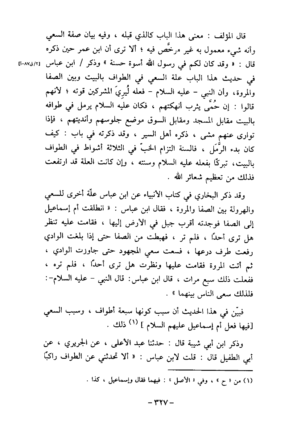 قال المؤلف: معنى هذا الباب كالذى قبله، وفيه بيان صفة السعى وأنه شىء معمول به غير مرخَّص فيه؛ ألا ترى أن ابن عمر حين ذكره قال: (وقد كان لكم فى رسول الله (صلى الله عليه وسلم) أسوة حسنة) وذكر ابن عباس فى حديث هذا الباب علة السعى فى الطواف بالبيت وبين الصفا والمروة، وأن النبى عليه السلام فعله لُيِرىَ المشركين قوته؛ لأنهم قالوا: إن حُمَّى يثرب أنهكتهم، فكان عليه السلام يرمل فى طوافه بالبيت مقابل المسجد ومقابل السوق موضع جلوسهم وأنديتهم، فإذا توارى عنهم مشى، ذكره أهل السير، وقد ذكرته فى باب: كيف كان بدء الرَّمَل، فالسنة التزام الخبّ فى الثلاثة أشواط فى الطواف بالبيت، تبركًا بفعله عليه السلام وسنته، وإن كانت العلة قد ارتفعت فذلك من تعظيم شعائر الله. وقد ذكر البخارى فى (كتاب الأنبياء) عن ابن عباس علّة أخرى للسعى والهرولة بين الصفا والمروة؛ فقال ابن عباس: (انطلقت أم إسماعيل إلى الصفا فوجدته أقرب جبل فى الأرض إليها، فقامت عليه تنظر هل ترى أحدًا، فلم تر، فهبطت من الصفا حتى إذا بلغت الوادى رفعت طرف درعها، فسعت سعى المجهود حتى جاوزت الوادى، ثم أتت المروة فقامت عليها ونظرت هل ترى أحدًا، فلم تره، ففعلت ذلك سبع مرات، قال ابن عباس: قال النبى عليه السلام: (فلذلك سعى الناس بينهما) . فبيّن فى هذا الحديث أن سبب كونها سبعة أطواف، وسبب السعى فيها فعل أم إسماعيل عليهم السلام ذلك. وذكر ابن أبى شيبة قال: حدثنا عبد العلى، عن الجريرى، عن أبى الطفيل قال: قلت لابن عباس: (ألا تحدثنى عن الطواف راكبًا