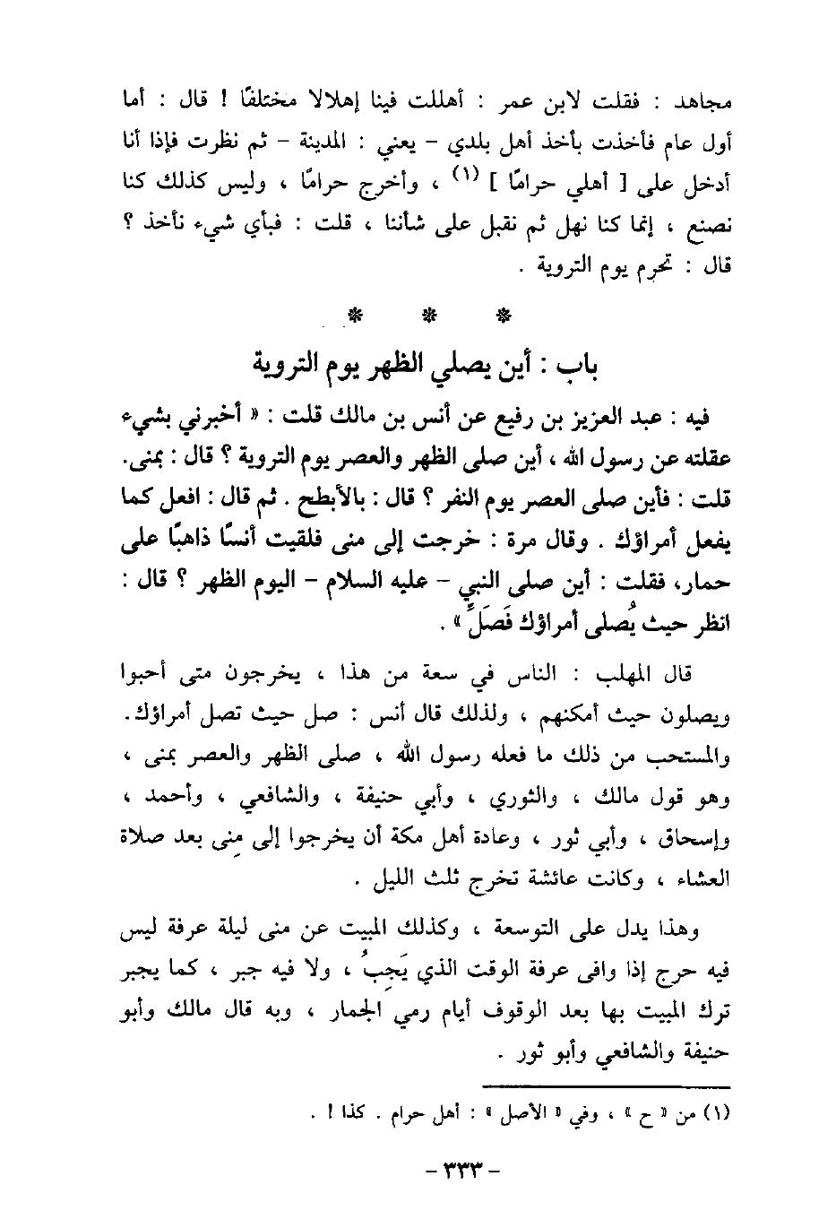 مجاهد: فقلت لابن عمر: أهللت فينا إهلالا مختلفًا قال: أما أول عام فأخذت بأخذ أهل بلدى، يعنى: المدينة، ثم نظرت فإذا أنا أدخل على أهلى حرامًا، وأخرج حرامًا، وليس كذلك نصنع، إنما كنا نهل ثم نقبل على شأننا، قلت: فبأى شىء نأخذ؟ قال: تحرم يوم التروية.