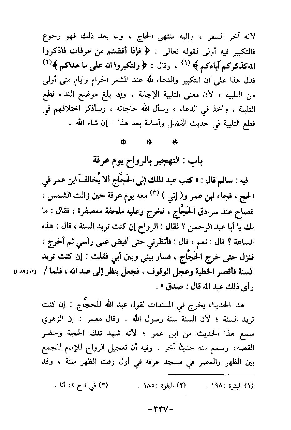 / 120 - فيه: سَالِم، قَالَ: كَتَبَ عَبْدُالْمَلِكِ إِلَى الْحَجَّاجِ أَنْ لا يُخَالِفَ ابْنَ عُمَرَ فِى الْحَجِّ، فَجَاءَ ابْنُ عُمَرَ وَأَنَا مَعَهُ يَوْمَ عَرَفَةَ حِينَ زَالَتِ الشَّمْسُ، فَصَاحَ عِنْدَ سُرَادِقِ الْحَجَّاج، فَخَرَجَ وَعَلَيْهِ مِلْحَفَةٌ مُعَصْفَرَةٌ، فَقَالَ: مَا لَكَ يَا أَبَا عَبْدِالرَّحْمَنِ؟ فَقَالَ: الرَّوَاحَ إِنْ كُنْتَ تُرِيدُ السُّنَّةَ، قَالَ: هَذِهِ السَّاعَةَ؟ قَالَ: نَعَمْ، قَالَ: فَأَنْظِرْنِى حَتَّى أُفِيضَ عَلَى رَأْسِى، ثُمَّ أَخْرُجُ، فَنَزَلَ حَتَّى خَرَجَ الْحَجَّاجُ، فَسَارَ بَيْنِى وَبَيْنَ أَبِى، فَقُلْتُ: إِنْ كُنْتَ تُرِيدُ السُّنَّةَ فَاقْصُرِ الْخُطْبَةَ وَعَجِّلِ الْوُقُوفَ، فَجَعَلَ يَنْظُرُ إِلَى عَبْدِاللَّهِ، فَلَمَّا رَأَى ذَلِكَ عَبْدُاللَّهِ، قَالَ: صَدَقَ. هذا الحديث يخرج فى المسندات لقول عبد الله للحجَّاج: إن كنت تريد السنة؛ لأن السنة سنة رسول الله. وقال معمر: إن الزهرى سمع هذا الحديث من ابن عمر؛ لأنه شهد تلك الحجة وحضر القصة، وسمع منه حديثًا آخر، وفيه أن تعجيل الرواح للإمام للجمع بين الظهر والعصر فى مسجد عرفة فى أول وقت الظهر سنة، وقد