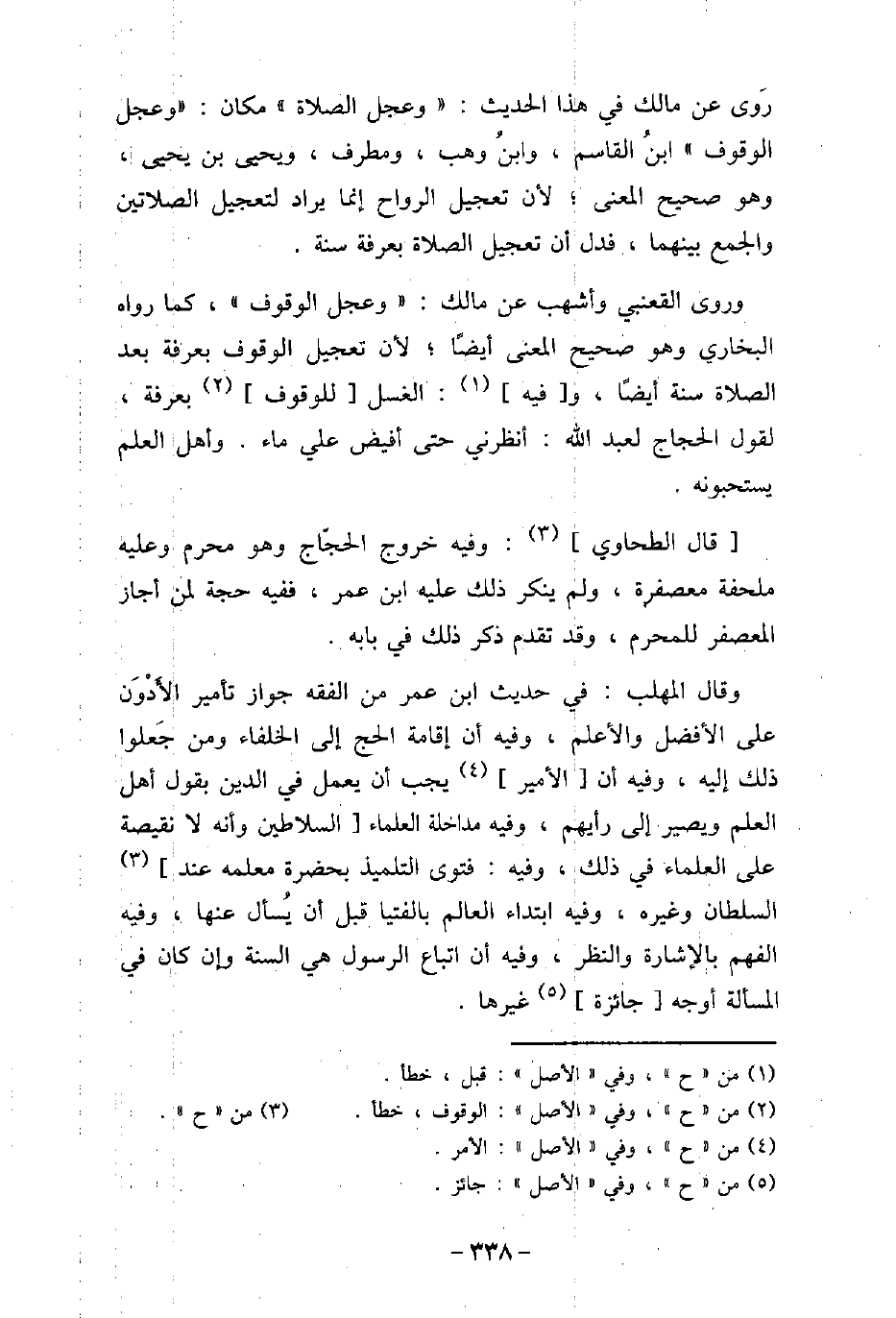 رَوى عن مالك فى هذا الحديث: (وعجل الصلاة) مكان: (وعجل الوقوف) ابنُ القاسم، وابنُ وهب، ومطرف، ويحيى بن يحيى، وهو صحيح المعنى؛ لأن تعجيل الرواح إنما يراد لتعجيل الصلاتين والجمع بينهما، فدل أن تعجيل الصلاة بعرفة سنة. وروى القعنبى وأشهب عن مالك: (وعجل الوقوف) ، كما رواه البخارى وهو صحيح المعنى أيضًا؛ لأن تعجيل الوقوف بعرفة بعد الصلاة سنة أيضًا، وفيه: الغسل للوقوف بعرفة، لقول الحجاج لعبد الله: أنظرنى حتى أفيض على ماء. وأهل العلم يستحبونه. قال الطحاوى: وفيه خروج الحجّاج وهو محرم وعليه ملحفة معصفرة، ولم ينكر ذلك عليه ابن عمر، ففيه حجة لمن أجاز المعصفر للمحرم، وقد تقدم ذكر ذلك فى بابه. وقال المهلب: فى حديث ابن عمر من الفقه جواز تأمير الأّدْوَن على الأفضل والأعلم، وفيه أن إقامة الحج إلى الحلفاء ومن جَعلوا ذلك إليه، وفيه أن الأمير يجب أن يعمل فى الدين بقول أهل العلم ويصير إلى رأيهم، وفيه مداخلة العلماء السلاطين وأنه لا نقيصة على العلماء فى ذلك، وفيه: فتوى التلميذ بحضرة معلمه عند السلطان وغيره، وفيه ابتداء العالم بالفتيا قبل أن يُسأل عنها، وفيه الفهم بالإشارة والنظر، وفيه أن اتباع الرسول (صلى الله عليه وسلم) هى السنة وإن كان فى المسألة أوجه جائزة غيرها.