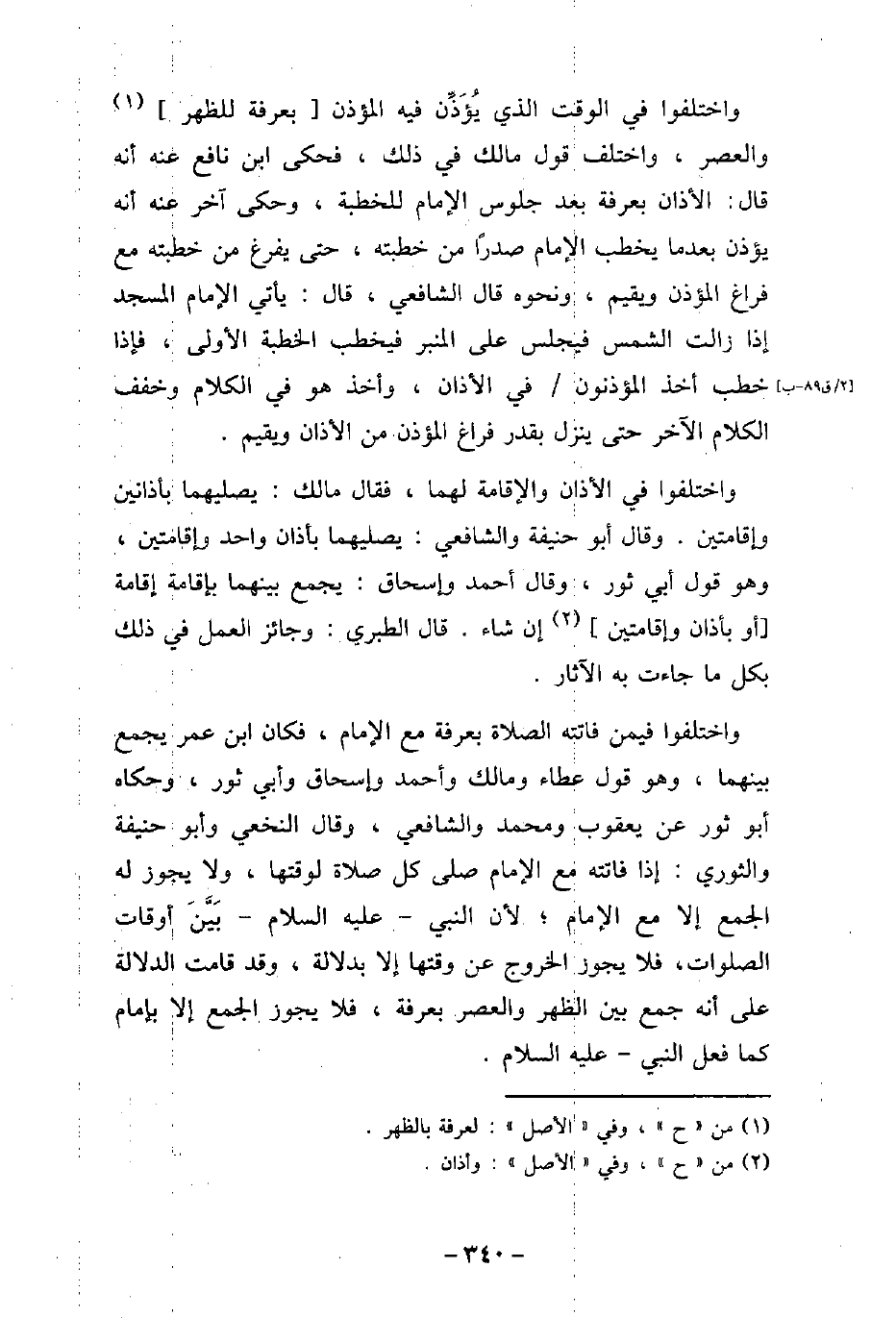 واختلفوا فى الوقت الذى يُؤَذَِن فيه المؤذن بعرفة للظهر والعصر، واختلف قول مالك فى ذلك، فحكى ابن نافع عنه أنه قال: الأذان بعرفة بعد جلوس الإمام للخطبة، وحكى آخر عنه أنه يؤذن بعدما يخطب الإمام صدرًا من خطبته، حتى يفرغ من خطبته مع فراغ المؤذن ويقيم، ونحوه قال الشافعى، قال: يأتى الإمام المسجد إذا زالت الشمس فيجلس على المنبر فيخطب الخطبة الأولى، فإذا خطب أخذ المؤذون فى الأذان، وأخذ هو فى الكلام وخفف الكلام الآخر حتى ينزل بقدر فراغ المؤذن من الأذان ويقيم. واختلفوا فى الأذان والإقامة لهما، فقال مالك: يصليهما بأذانين وإقامتين. وقال أبو حنيفة والشافعى: يصليهما بأذان واحد وإقامتين، وهو قول أبى ثور، وقال أحمد وإسحاق: يجمع بينهما بإقامة إقامة أو بأذان وإقامتين إن شاء. قال الطبرى: وجائز العمل فى ذلك بكل ما جاءت به الآثار. واختلفوا فيمن فاتته الصلاة بعرفة مع الإمام، فكان ابن عمر يجمع بينهما، وهو قول عطاء ومالك وأحمد وإسحاق وأبى ثور، وحكاه أبو ثور عن يعقوب ومحمد والشافعى، وقال النخعى وأبو حنيفة والثورى: إذا فاتته مع الإمام صلى كل صلاة لوقتها، ولا يجوز له الجمع إلا مع الإمام؛ لأن النبى عليه السلام بَيَّنَ أوقات الصلوات، فلا يجوز الخروج عن وقتها إلا بدلالة، وقد قامت الدلالة على أنه جمع بين الظهر والعصر بعرفة، فلا يجوز الجمع إلا بإمام كما فعل النبى عليه السلام.