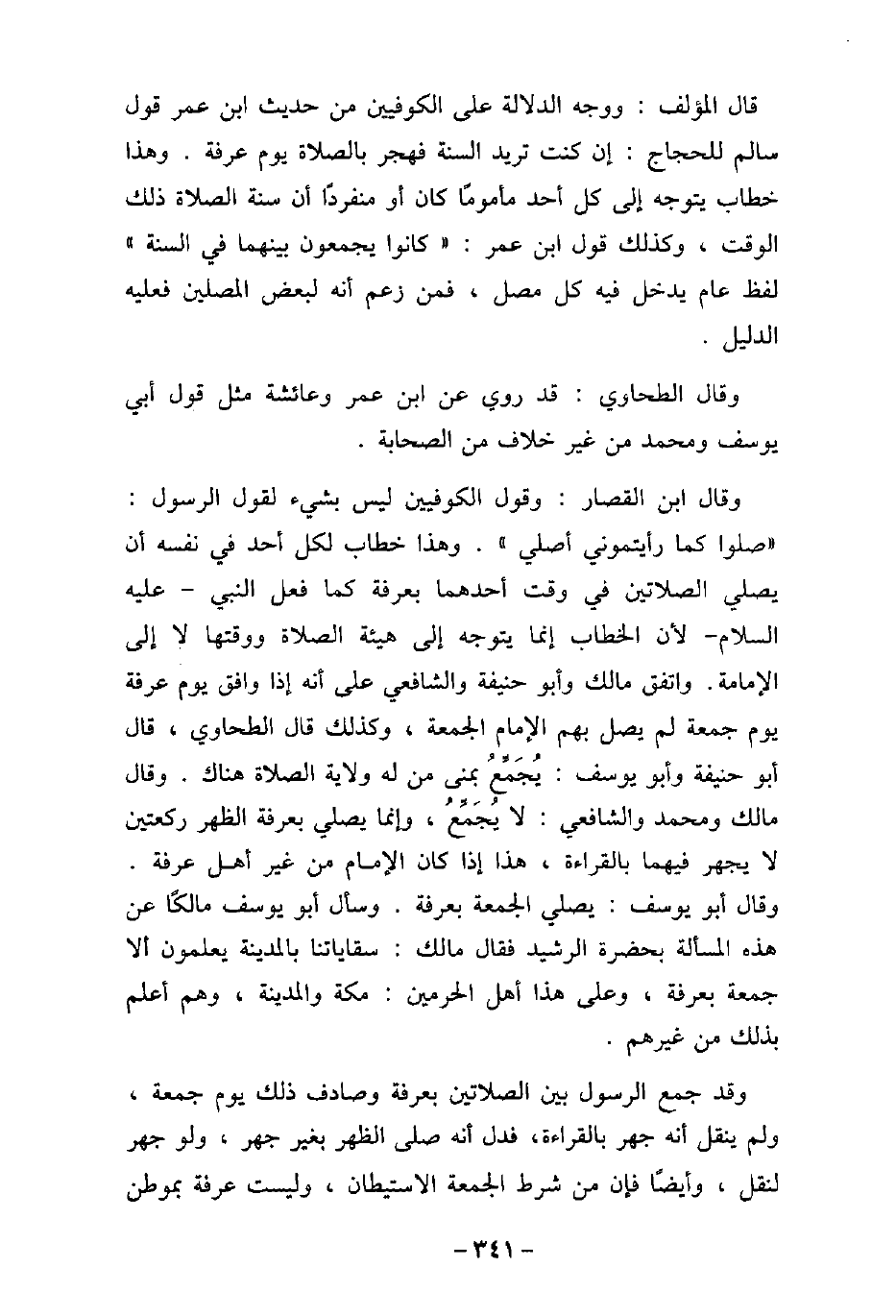 قال المؤلف: ووجه الدلالة على الكوفيين من حديث ابن عمكر قول سالم للحجاج: إن كنت تريد السنة فهجر بالصلاة يوم عرفة. وهذا خطاب يتوجه إلى كل أحد مأمومًا كان أو منفردًا أن سنة الصلاة ذلك الوقت، وكذلك قول ابن عمر: (كانوا يجمعون بينهما فى السنة) لفظ عام يدخل فيه كل مصل، فمن زعم أنه لبعض المصلين فعليه الدليل. وقال الطحاوى: قد روى عن ابن عمر وعائشة مثل قول أبى يوسف ومحمد من غير خلاف من الصحابة. وقال ابن القصار: وقول الكوفيين ليس بشىء لقول الرسول (صلى الله عليه وسلم) : (صلوا كما رأيتمونى أصلى) . وهذا خطاب لكل أحد فى نفسه أن يصلى الصلاتين فى وقت أحدهما بعرفة كما فعل النبى عليه السلام لأن الخطاب إنما يتوجه إلى هيئة الصلاة ووقتها لا إلى الإمامة. واتفق مالك وأبو حنيفة والشافعى على أنه إذا وافق يوم عرفة يوم الجمعة لم يصل بهم الإمام الجمعة، وكذلك قال الطحاوى، قال أبو حنيفة والشافعى: لا يُجَمِّعُ، وإنما يصلى بعرفة الظهر ركعتين لا يجهر فيهما بالقراءة، هذا إذا كان الإمام من غير أهل عرفة. وقال أبو يوسف: يصلى الجمعة بعرفة. وسأل أبو يوسف مالكًا عن هذه المسألة بحضرة الرشيد فقال مالك: سقاياتنا بالمدينة يعلمون ألا جمعة بعرفة، وعلى هذا أهل الحرمين: مكة والمدينة، وهم أعلم بذلك من غيرهم. وقد جمع الرسول (صلى الله عليه وسلم) بين الصلاتين بعرفة وصادف ذلك يوم جمعة، ولم ينقل أنه جهر بالقراءة، فدل أنه صلى الظهر بغير جهر، ولو جهر لنقل، وأيضًا فإن من شرط الجمعة الاستيطان، وليست عرفة بموطن