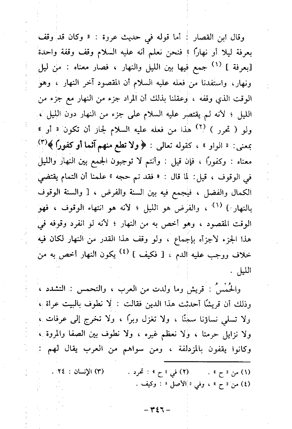 وقال ابن القصار: أما قوله فى حديث عروة: (وكان قد وقف بعرفة ليلا أو نهارًا) فنحن نعلم أنه عليه السلام وقف وقفة واحدة بعرفة جمع فيها بين الليل والنهار، فصار معناه: من ليل ونهار، واستفدنا من فعله عليه السلام أن المقصود آخر النهار، وهو الوقت الذى وقفه، وعقلنا بذلك أن المراد جزء من النهار مع جزء من الليل؛ لأنه لم يقتصر عليه السلام على جزء من النهار دون الليل، ولو تحرر هذا من فعله عليه السلام لجاز أن تكون (أو) بمعنى: (الواو) ، كقوله تعالى: (وَلاَ تُطِعْ مِنْهُمْ آثِمًا أَوْ كَفُورًا) [الإنسان: 24] معناه: وكفورًا، فإن قيل: وأنتم لا توجبون الجمع بين النهار والليل فى الوقوف، قيل: لما قال: (فقد تم حجه) علمنا أن التمام يقتضى الكمال والفضل، فيجمع فيه بين السنة والفرض، والسنة الوقوف بالنهار، والفرض هو الليل؛ لأنه هو انتهاء الوقوف، فهو الوقت المقصود، وهو أخص به من النهار؛ لأنه لو انفرد وقوفه فى هذا الجزء لأجزأه بإجماع، ولووقف هذا القدر من النهار لكان فيه خلاف ووجب عليه الدم، فكيف يكون النهار أخص به من الليل. والحُمْسُ: قريش وما ولدت من العرب، والتحمس: التشدد، وذلك أن قريشًا أحدثت هذا الدين فقالت: لا نطوف بالبيت عراة، ولا تسلى نساؤنا سمنًا، ولا تغزل وبرًا، ولا تخرج إلى عرفات، ولا نزايل حرمنا، ولا نعظم غيره، ولا نطوف بين الصفا والمروة، وكانوا يقفون بالمزدلفة، ومن سواهم من العرب يقال لهم: