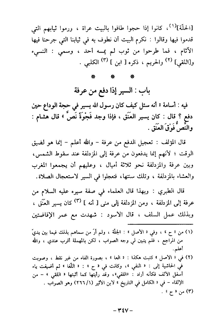/ 125 - فيه: [عروة] أنه سُئِلَ [أسامة بن زيد] كَيْفَ كَانَ رَسُولُ اللَّهِ (صلى الله عليه وسلم) يَسِيرُ فِى حَجَّةِ الْوَدَاعِ حِينَ دَفَعَ؟ قَالَ: كَانَ يَسِيرُ الْعَنَقَ، فَإِذَا وَجَدَ فَجْوَةً نَصَّ، قَالَ هِشَامٌ: وَالنَّصُّ فَوْقَ الْعَنَقِ. قال المؤلف: تعجيل الدفع من عرفة والله أعلم إنما هو لضيق الوقت؛ لأنهم إنما يدفعون من عرفة إلى المزدلفة عند سقوط الشمس، وبين عرفة والمزدلفة نحو ثلاثة أميال، وعليهم أن يجمعوا المغرب والعشاء بالمزدلفة، وتلك سنتها، فتعجلوا فى السير لاستعجال الصلاة. قال الطبرى: وبهذا قال العلماء فى صفة سيره عليه السلام من عرفة إلى المزدلفة، ومن المزدلفة إلى منى أنه كان يسير العَنَق، وبذلك عمل السلف، قال الأسود: شهدت مع عمر الإفاضتين
