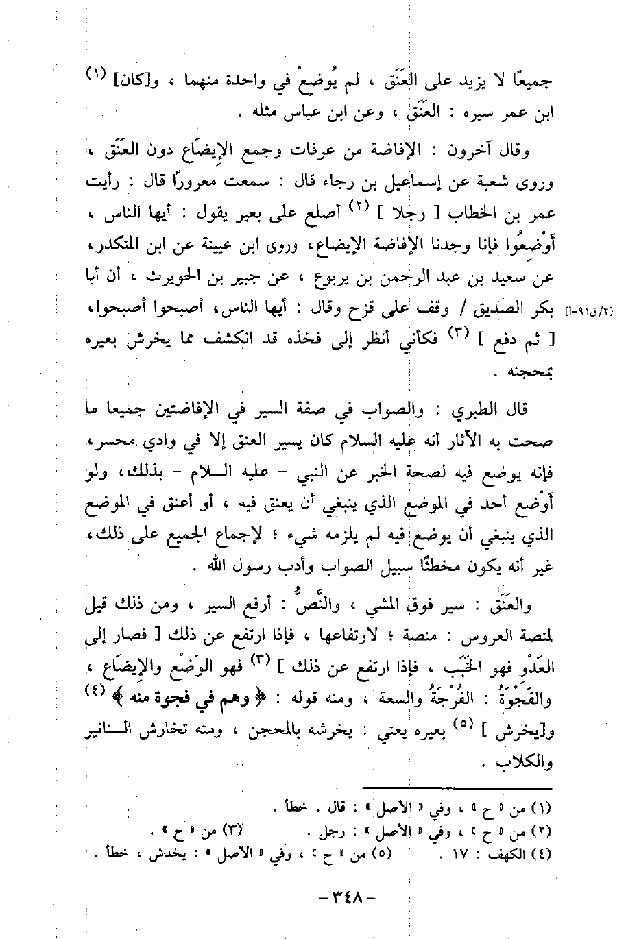 جميعًا لا يزيد على العَنَق، لم يُوضِعْ فى واحدة منهما، وكان ابن عمر سيره: العَنَق، وعن ابن عباس مثله. وقال آخرون: الإفاضة من عرفات وجمع الإِيضَاع دون العَنَق، وروى شعبة عن إسماعيل بن رجاء قال: سمعت معرورًا قال: رأيت عمر بن الخطاب رجلا أصلع على بعير يقول: أيها الناس، أَوْضِعُوا فإنا وجدنا الإفاضة الإيضاع، وروى ابن عيينة عن ابن المنكدر، عن سعيد بن عبد الرحمن بن يربوع، عن جبير بن الحويرث، أن أبا بكر الصديق وقف على قزح وقال: أيها الناس، أصبحوا أصبحوا، ثم دفع فكأنى أنظر إلى فخذه قد انكشف مما يخرش بعيره بمحجنه. قال الطبرى: والصواب فى صفة السير فى الإفاضتين جميعا ما صحت به الآثار أنه عليه السلام كان يسير العنق إلا فى وادى محسر، فإنه يوضع فيه لصحة الخبر عن النبى عليه السلام بذلك، ولو أَوْضع أحد فى الموضع الذى ينبغى أن يعنق فيه، أو أعنق فى الموضع الذى ينبغى أن يوضع فيه لم يلزمه شئ؛ لإجماع الجميع على ذلك، غير أنه يكون مخطئًا سبيل الصواب وأدب رسول الله (صلى الله عليه وسلم) . والعَنَق: سير فوق المشى، والنَّصُّ: أرفع السير، ومن ذلك قيل لمنصة العروس: منصة؛ لارتفاعها، فإذا ارتفع عن ذلك فصار إلى العَدْوِ فهو الخَبَب، فإذا ارتفع عن ذلك فهو الوَضْع والإِيضَاع، والفَجْوَةُ: الفُرْجَةُ والسعة، ومنه قوله: (وَهُمْ فِى فَجْوَةٍ مِّنْهُ) [الكهف: 17] ويخرش بعيره يعنى: يخرشه بالمحجن، ومنه تخارش السنانير والكلاب.