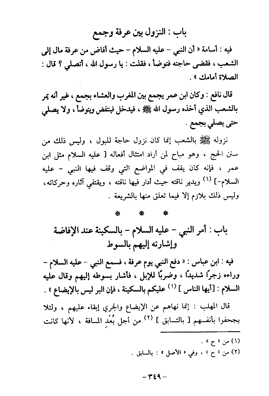 / 126 - فيه: أُسَامَةَ، أَنَّ النَّبِىَّ، عليه السَّلام، حَيْثُ أَفَاضَ مِنْ عَرَفَةَ، مَالَ إِلَى الشِّعْبِ، فَقَضَى حَاجَتَهُ فَتَوَضَّأَ، فَقُلْتُ: يَا رَسُولَ اللَّهِ أَتُصَلِّى؟ فَقَالَ: (الصَّلاةُ أَمَامَكَ؟) . / 127 - وفيه: نَافِعٍ، وَكَانَ ابْن عُمَرَ يَجْمَعُ بَيْنَ الْمَغْرِبِ وَالْعِشَاءِ بِجَمْعٍ، غَيْرَ أَنَّهُ يَمُرُّ بِالشِّعْبِ الَّذِى أَخَذَهُ رَسُولُ اللَّهِ (صلى الله عليه وسلم) ، فَيَدْخُلُ، فَيَنْتَفِضُ وَيَتَوَضَّأُ، وَلا يُصَلِّى حَتَّى يُصَلِّىَ بِجَمْعٍ. نزوله (صلى الله عليه وسلم) بالشعب إنما كان نزول حاجة للبول، وليس ذلك من سنن الحج، وهو مباح لمن أراد امتثال أفعاله عليه السلام مثل ابن عمر، فإنه كان يقف فى المواضع التى وقف فيها النبى عليه السلام ويدير ناقته حيث أدار فيها ناقته، ويقتفى آثاره وحركاته، وليس ذلك بلازم إلا فيما تعلق منها بالشريعة.