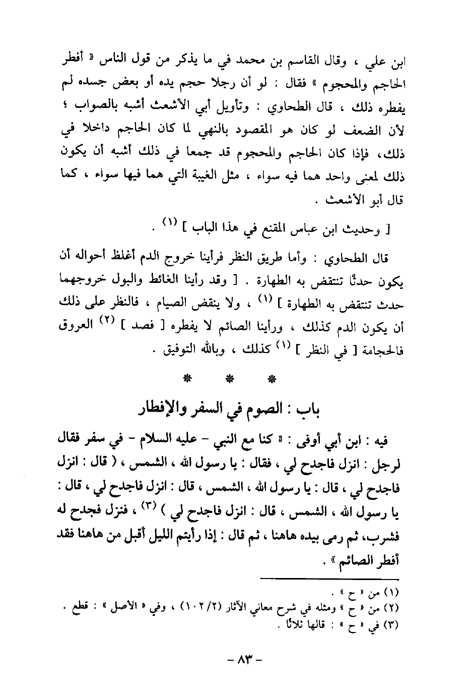 ابن على، وقال القاسم بن محمد فى ما يذكر من قول الناس (أفطر الحاجم والمحجوم) ، فقال: لو أن رجلا حجم يده أو بعض جسده لم يفطره ذلك، قال الطحاوى، وتأويل أبى الأشعث أشبه بالصواب، لأن الضعف لو كان هو المقصود بالنهى لما كان الحاجم داخلا فى ذلك، فإذا كان الحاجم والمحجوم قد جمعا فى ذلك أشبه أن يكون ذلك لمعنى واحد هما فيه سواء، مثل الغيبة التى هما فيها سواء، كما قال أبو الأشعث. وحديث ابن عباس المقنع فى هذا الباب. قال الطحاوى: وأما طريق النظر فرأينا خروج الدم أغلظ أحواله أن يكون حدثًا تنتقض به الطهارة. وقد رأينا الغائط والبول خروجهما حدث تنتقض به الطهارة، ولا ينقض الصيام، فالنظر على ذلك أن يكون الدم كذلك، ورأينا لا يفطره فصد العروق فالحجامة فى النظر كذلك، وبالله التوفيق.