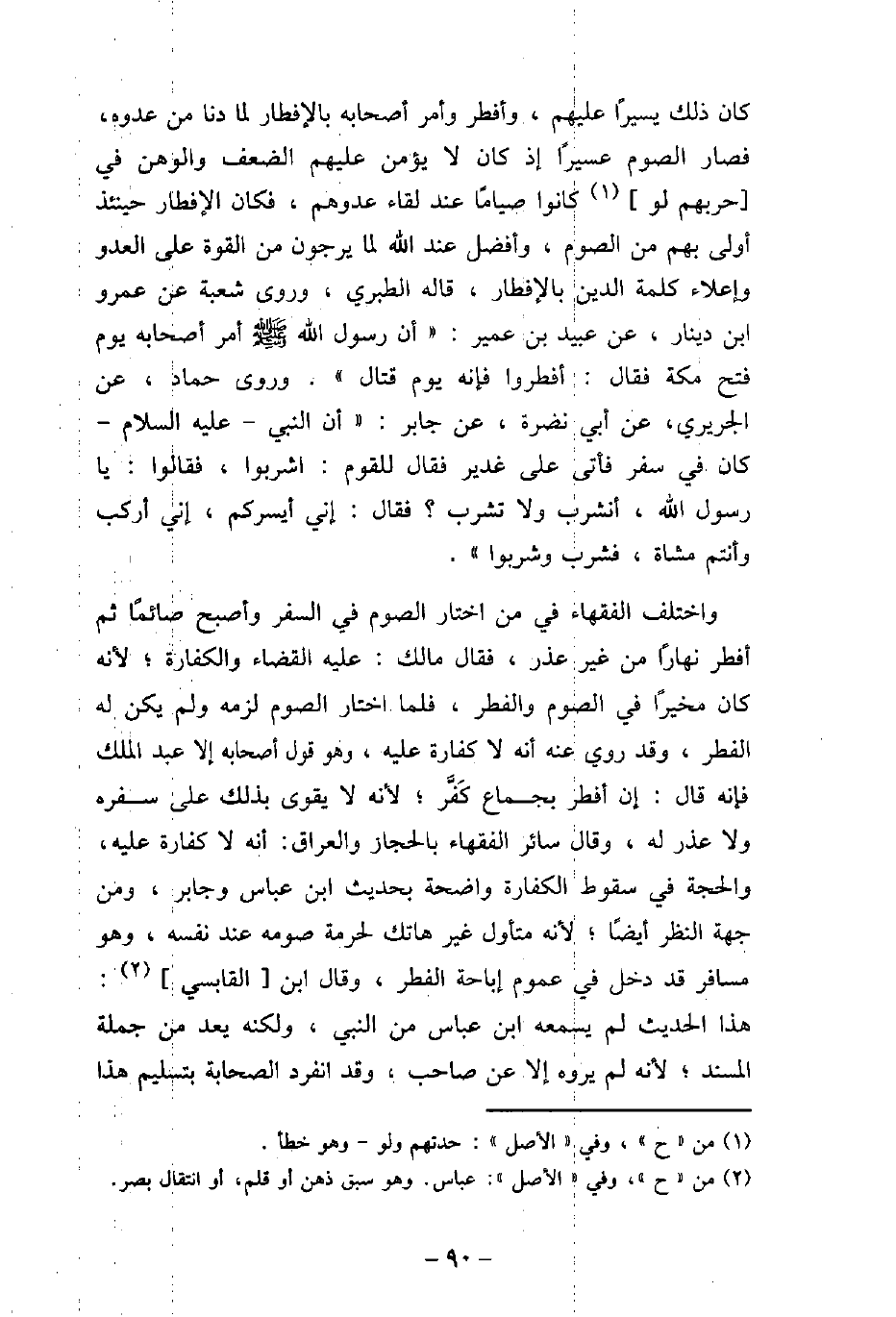 كان ذلك يسيرًا عليهم، وأفطر وأمر أصحابه لما دنا من عدوه، فصار الصوم عسيرًا، إذ كان لا يؤمن عليهم الضعف والوهن فى حربهم لو كانوا صيامًا عند لقاء عدوهم، فكان الإفطار حينئذ أولى بهم من الصوم، وأفضل عند الله لما يرجون من القوة على العدو وإعلاء كلمة الدين بالإفطار، قاله الطبرى، وروى شعبة عن عمرو بن دينار، عن عبيد بن عمير: (أن رسول الله (صلى الله عليه وسلم) أمر أصحابه يوم فتح مكة، فقال: أفطروا فإنه يوم قتال) . وروى حماد، عن الجريرى، عن أبى نضرة، عن جابر: (أن النبى، عليه السلام، كان فى سفر فأتى على غدير فقال للقوم: (اشربوا) ، فقالوا: يا رسول الله، أنشرب ولا تشرب؟ فقال: (إنى أيسركم، إنى أركب وأنتم مشاة، فشرب وشربوا) . واختلف الفقهاء فى من اختار الصوم فى السرف وأصبح صائمًا ثم أفطر نهارًا من غير عذر، فقال مالك: عليه القضاء والكفارة، لأنه كان مخيرًا فى الصوم والفطر، فلما اختار الصوم لزمه ولم يكن له الفطر، وقد روى عنه أنه لا كفارة عليه، وهو قول أصحابه إلا عبد الملك فإنه قال: إن أفطر بجماع كَفَّر، لأنه لا يقوى بذلك على سفره ولا عذر له، وقال سائر الفقهاء بالحجاز والعراق: أنه لا كفارة عليه، والحجة فى سقوط الكفارة واضحة بحديث ابن عباس وجابر، ومن جهة النظر أيضًا، لأنه متأول غير هاتك لحرمة صومه عند نفسه، وهو مسافر قد دخل فى عموم إباحة الفطر، وقال ابن القابسى: هذا الحديث لم يسمعه ابن عباس من النبى، ولكنه يعد من جملة المسند، لأنه لم يروه إلا عن صاحب، وقد انفرد الصحابة بتسليم هذا